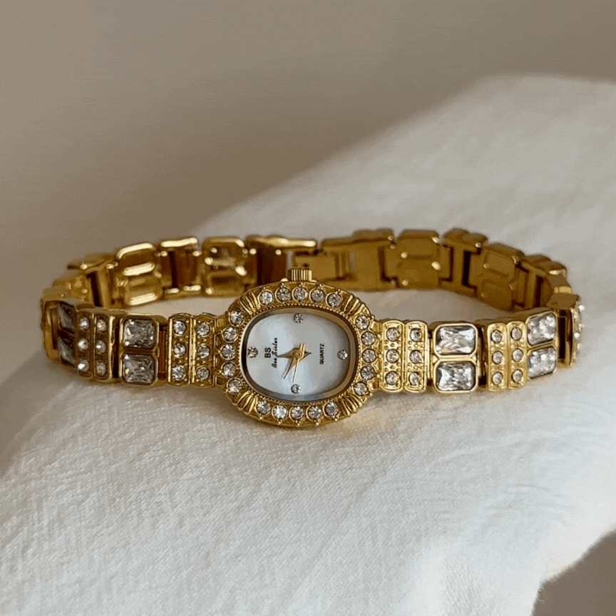 Gem-Embellished Gold Bracelet Watch with White Oval Small Dial – Women’s Quartz Watch
