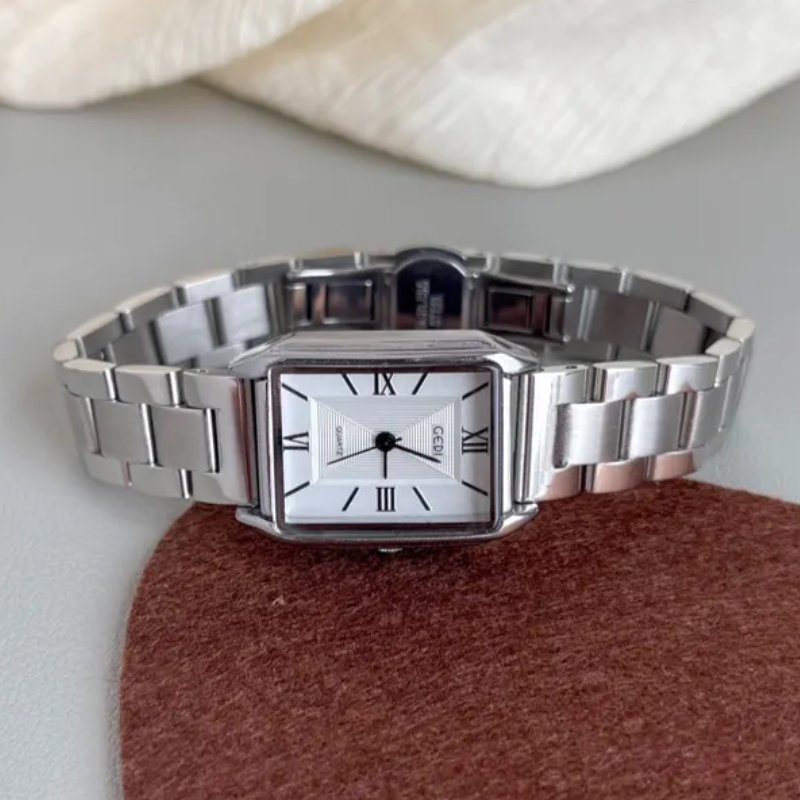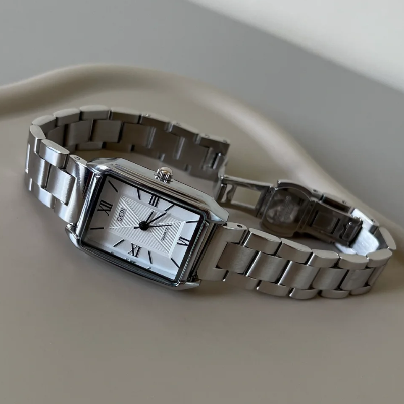 This women’s quartz watch features a clean white dial adorned with subtle geometric elements, paired with a sleek silver-tone bracelet. Designed for lovers of structure, space、and quiet confidence—it’s an effortlessly modern piece that goes with everything yet feels like nothing else.