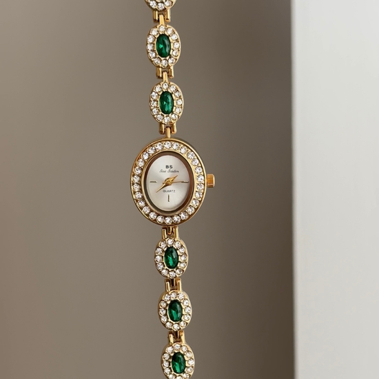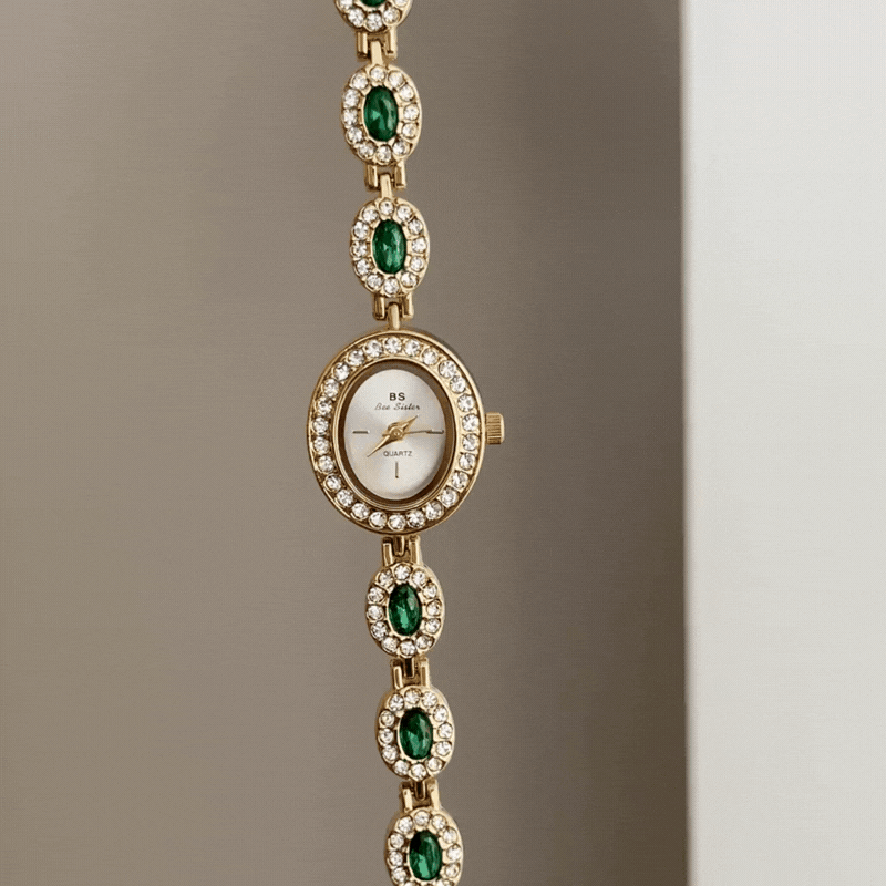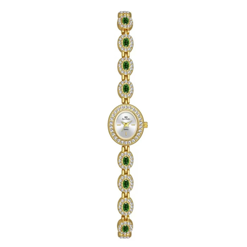 A masterpiece of refined artistry, this watch features a pristine white oval dial framed by a diamond-set gold bezel and a bracelet adorned with genuine emerald-cut green gemstones. Powered by reliable quartz, it is lightweight, scratch-resistant, and water-resistant for daily comfort. A symbol of grace and natural beauty, it transitions effortlessly from day to evening—ideal as a cherished gift or personal indulgence.