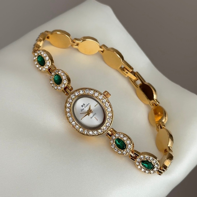 Glamour Elegant: White Oval Dial Watch with Gold Diamond Bezel & Emerald Gemstone Alloy Bracelet