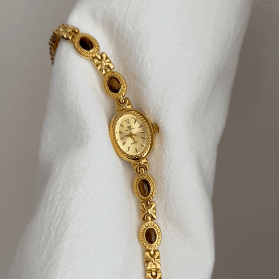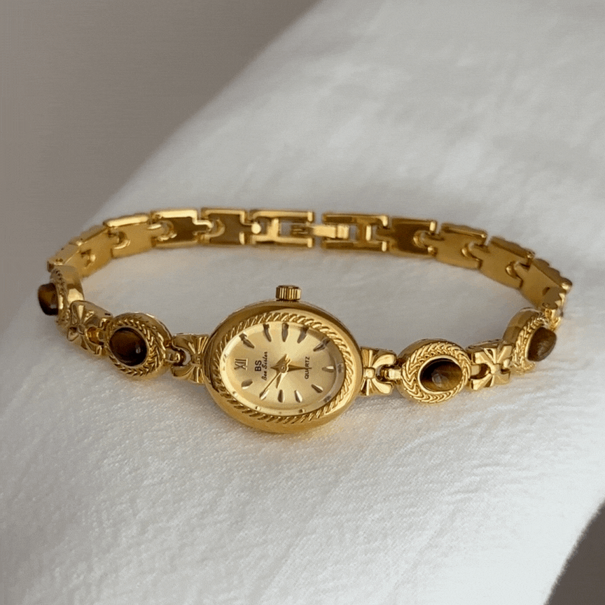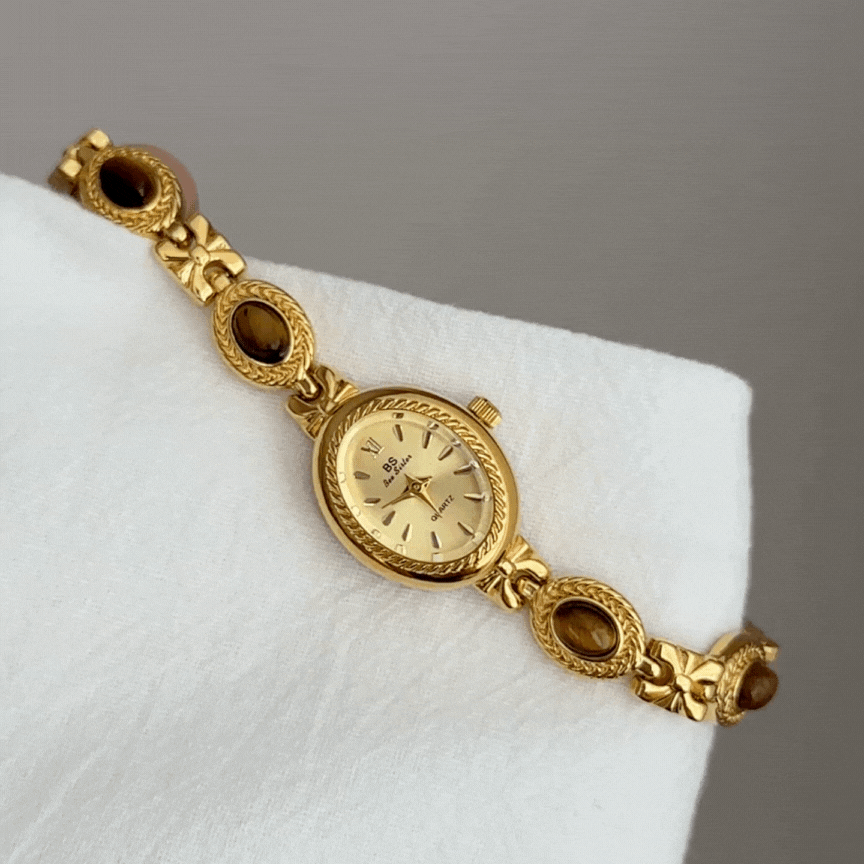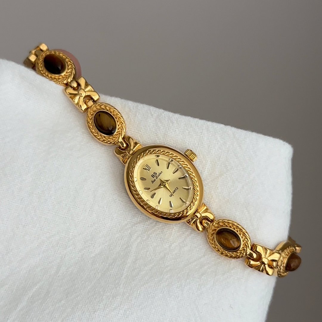 Vintage Romantic Gold Bracelet Watch with Tiger’s Eye Inlay & Oval Small Dial – Women’s Quartz Watch