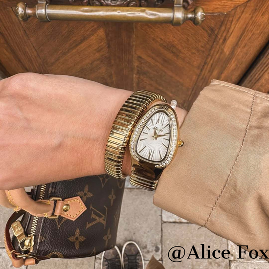 This unique watch features a flexible serpent-style gold bracelet, a radiant white dial, and shimmering diamond accents. A statement piece combining elegance with bold design for any occasion.
