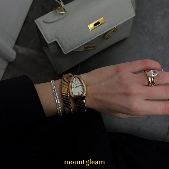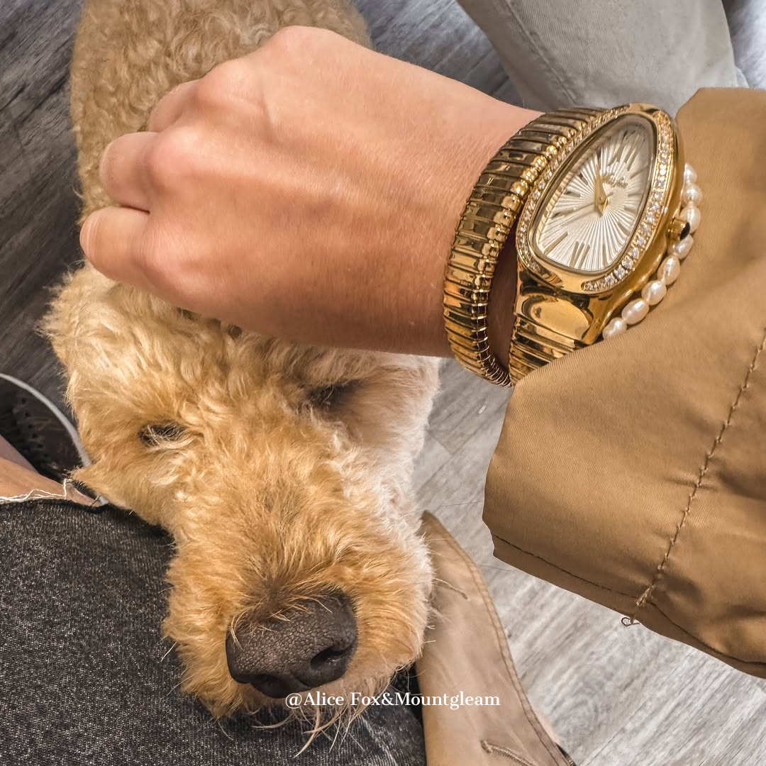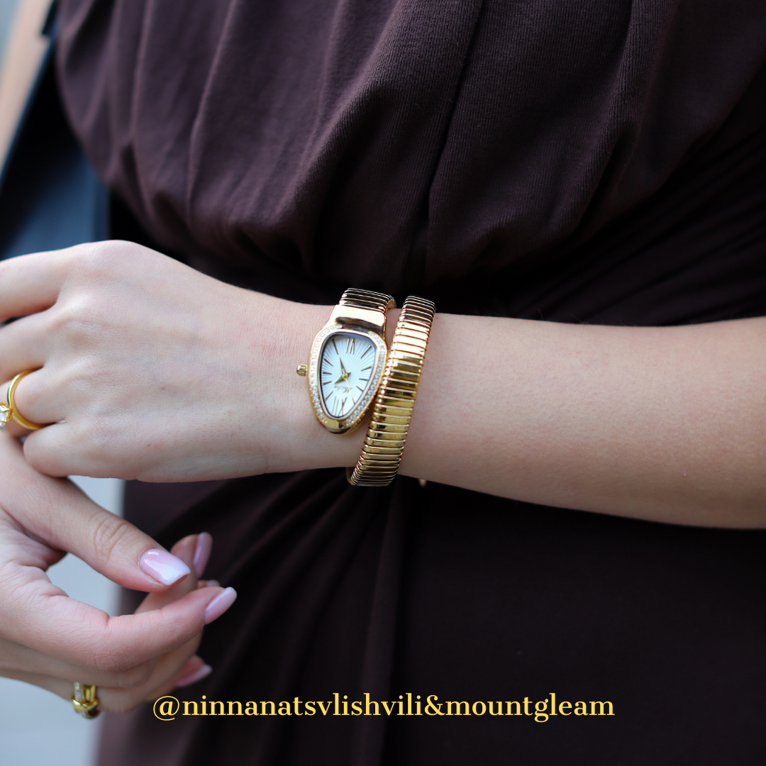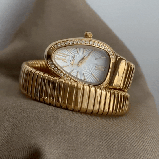 This unique watch features a flexible serpent-style gold bracelet, a radiant white dial, and shimmering diamond accents. A statement piece combining elegance with bold design for any occasion.