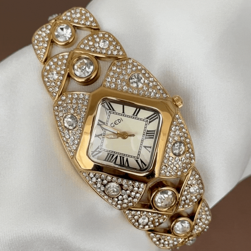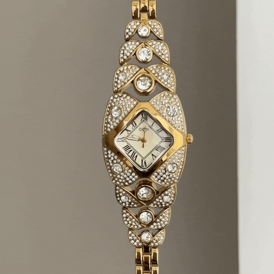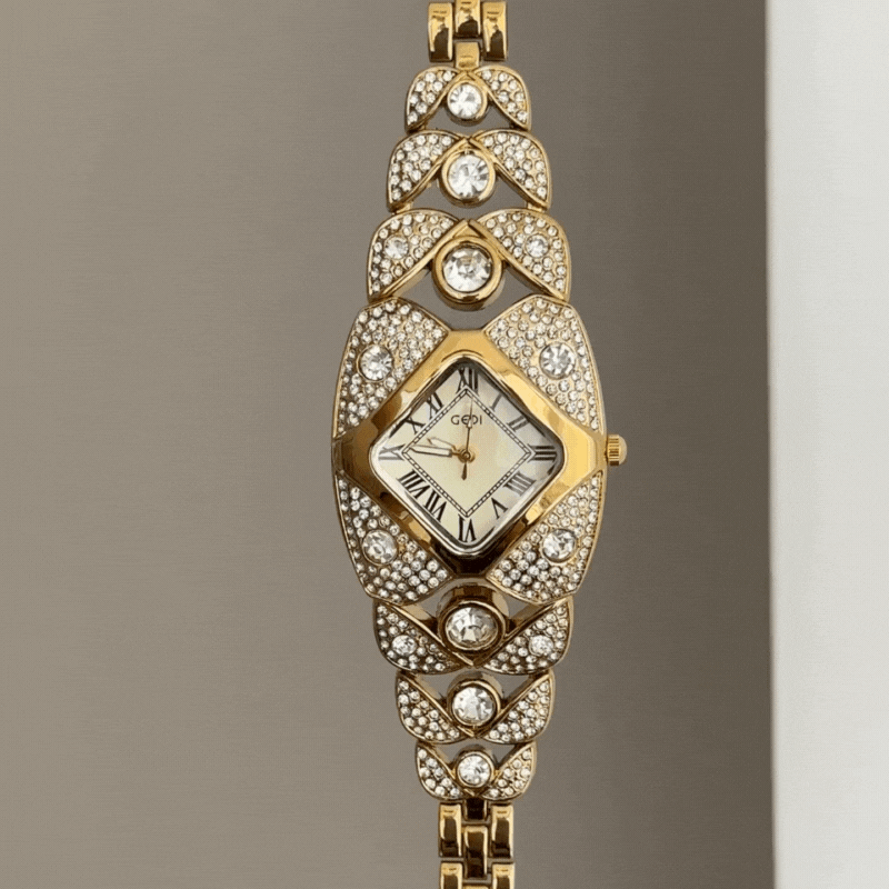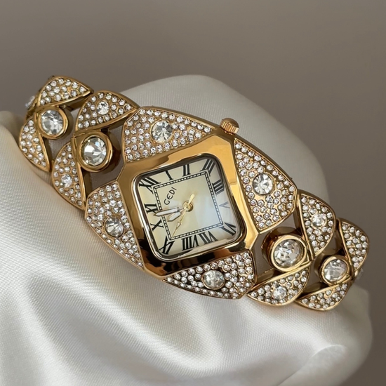 Exuding luxury, this exceptional timepiece presents a gold diamond-shaped dial embraced by a diamond-paved bezel, creating captivating brilliance. The matching gold alloy bracelet, transformed into a jewelry-grade strap, continues the diamond pattern from case to clasp. Precision quartz movement ensures accurate timekeeping within its architectural design that blends fine watchmaking with high jewelry.