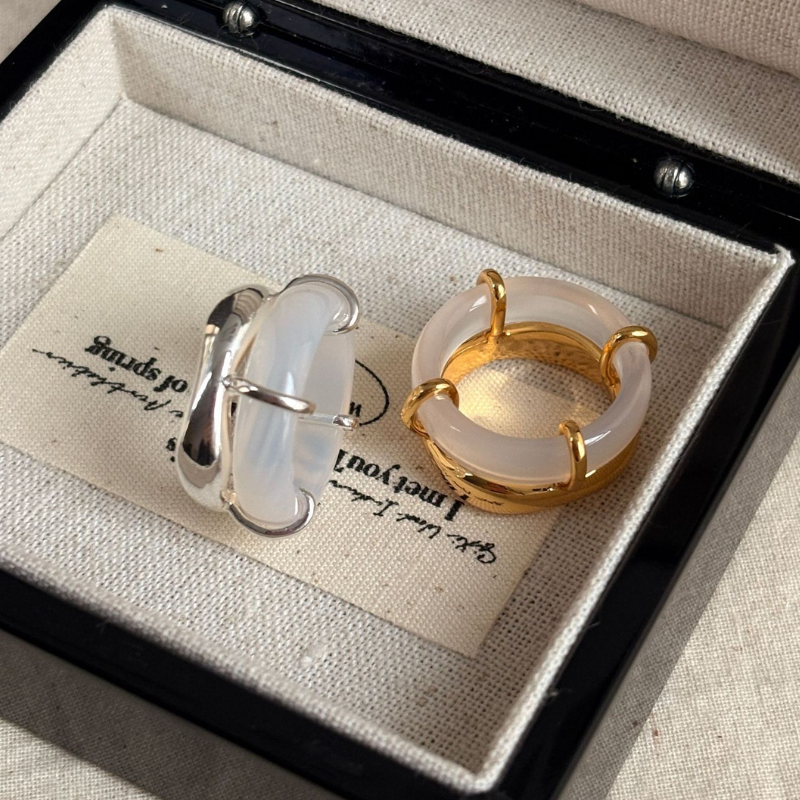 Clean, modern, and effortlessly refined, this icy white chalcedony double-layer ring features a bold yet elegant design made to stand out. The translucent white chalcedony has a cool, glass-like clarity, giving the ring a high-end, minimalist aesthetic with strong personality.