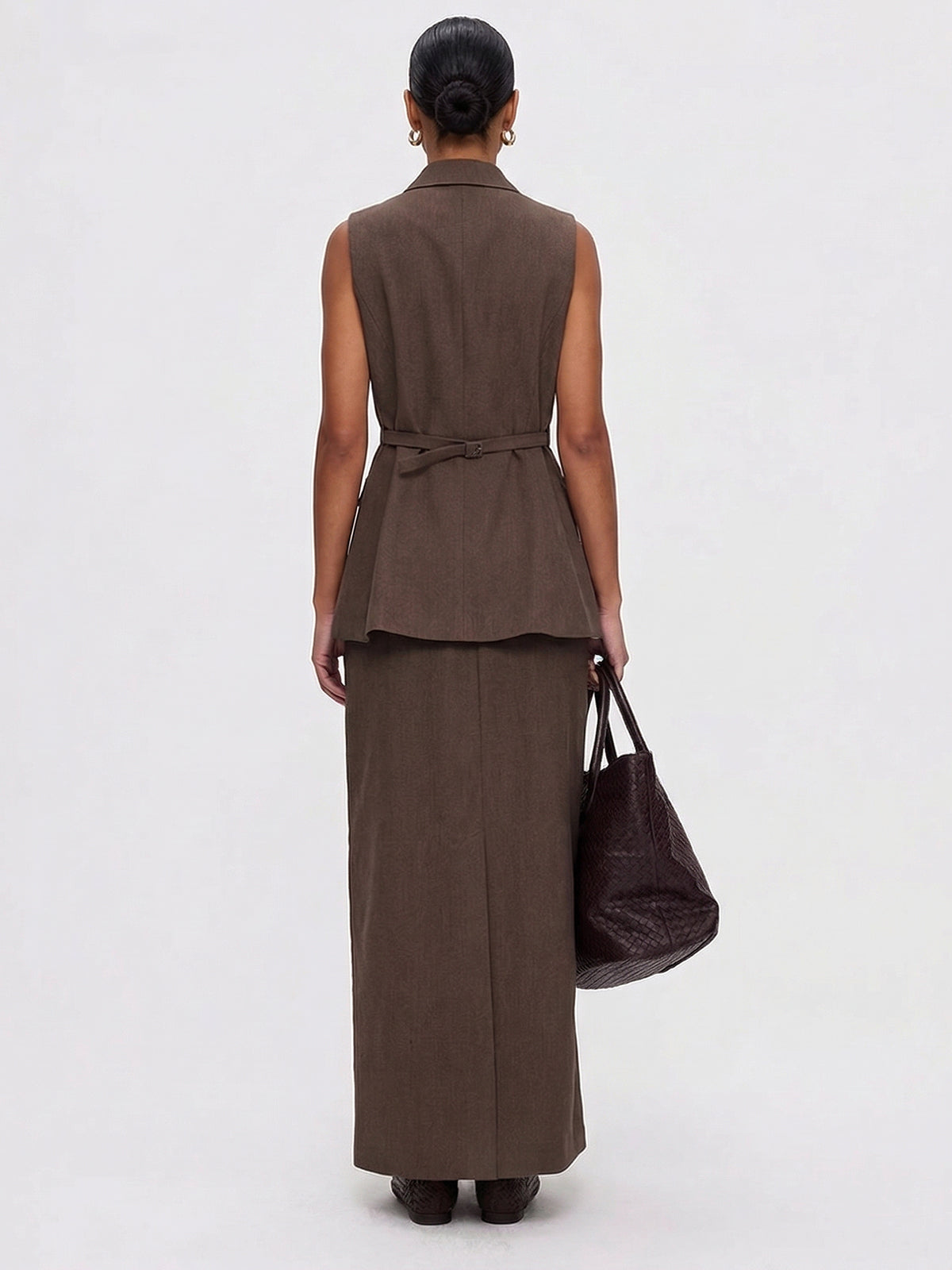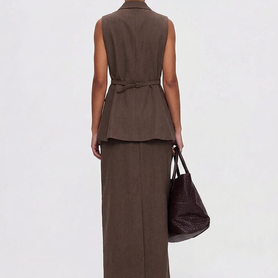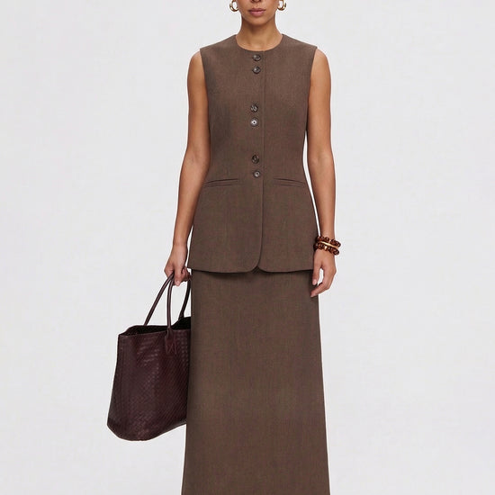 Master the "Old Money" aesthetic with this elegantly tailored two-piece set, featuring a structured sleeveless vest and a matching high-waisted maxi skirt. Crafted from a premium breathable blend, its clean architectural lines and snatched-waist silhouette balance professional power with modern feminine grace.