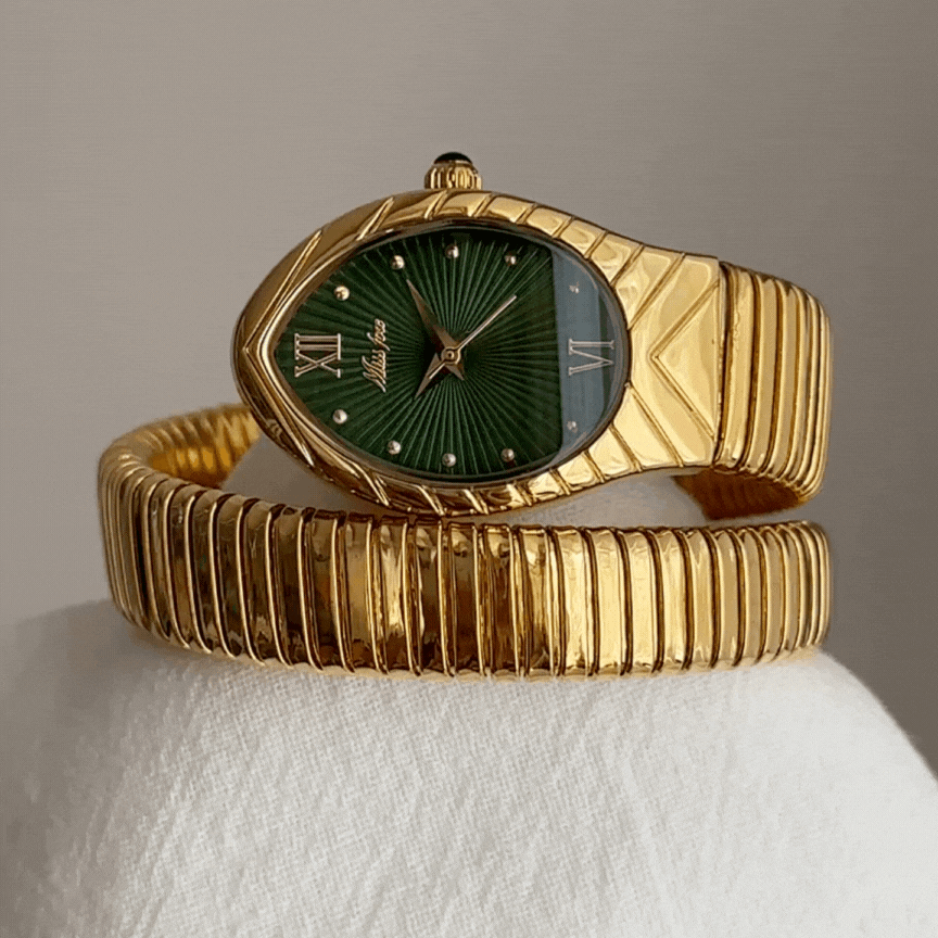 Luxury Gold Serpenti Wrap Women’s Quartz Watch with Flexible Bracelet & Unique Green Dial