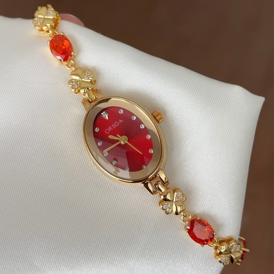 This luxurious timepiece features a red oval diamond dial set in a gold bezel, paired with a bracelet artistically arranged with diamonds and red gemstones. Its ergonomic clasp and flexible links ensure comfort without compromising elegance. Precision quartz movement guarantees accurate timekeeping in a curved silhouette.