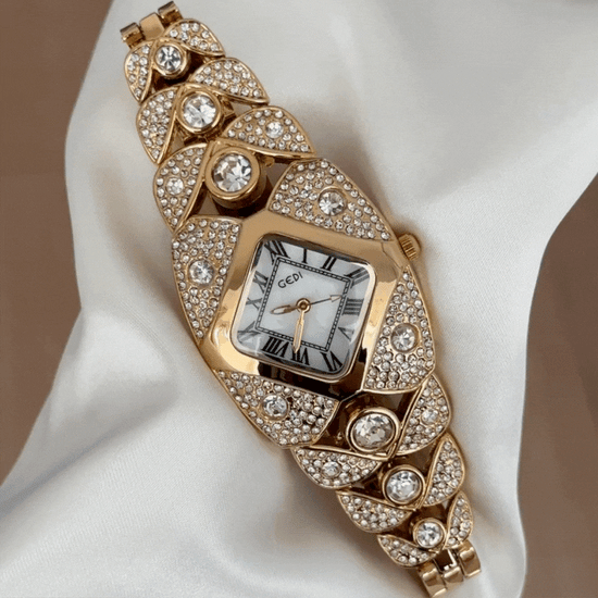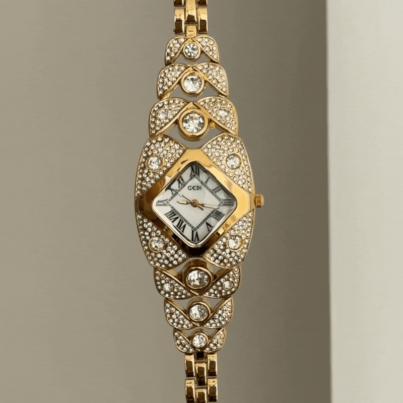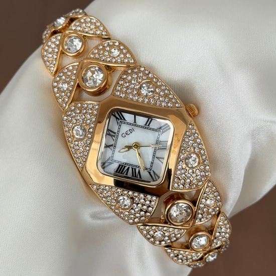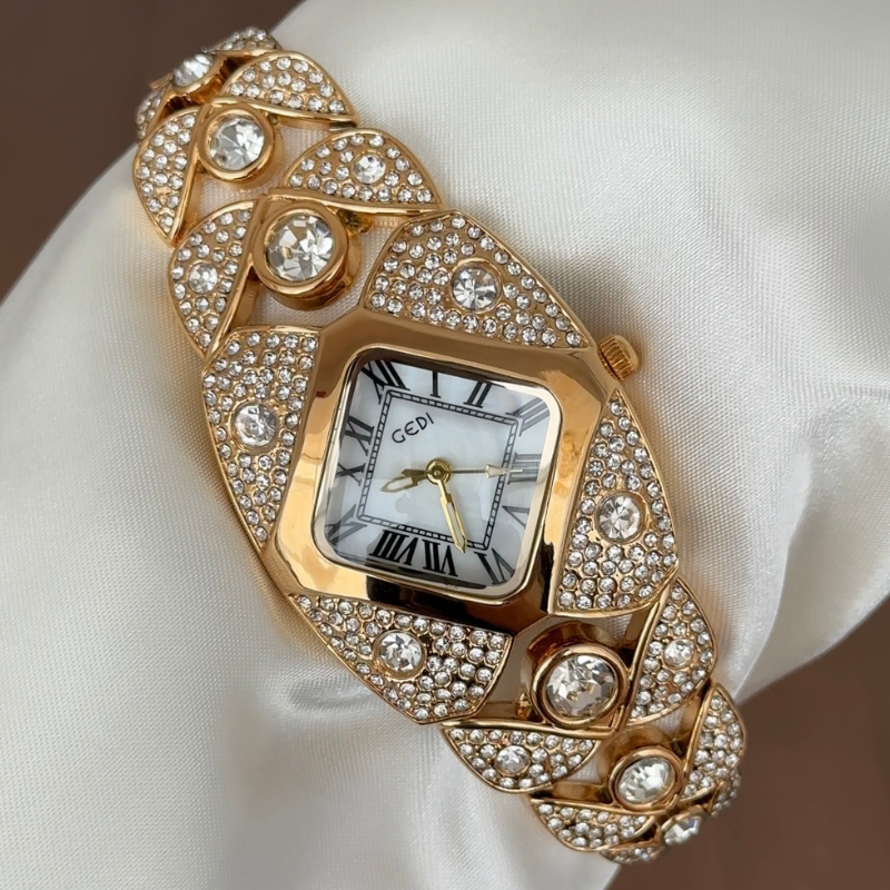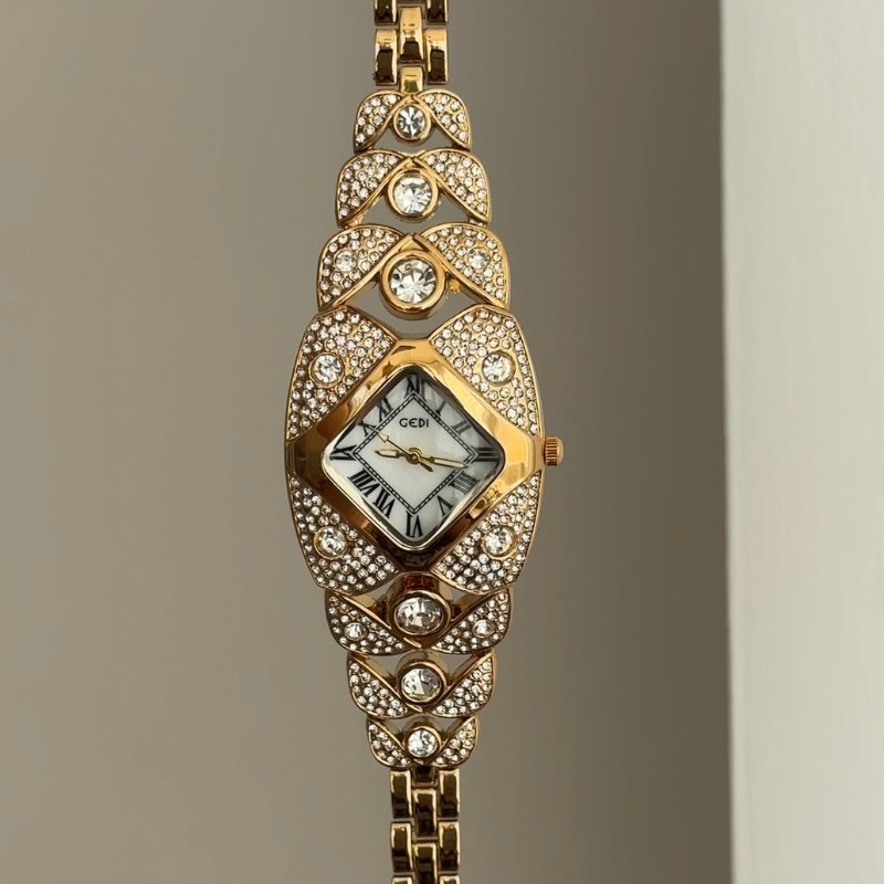 Exuding opulence, this exceptional timepiece features a white diamond-shaped dial set within a fully diamond-crusted gold bezel. The matching gold alloy bracelet, transformed into a jewelry-grade strap, continues the diamond pattern from case to clasp. Precision quartz movement ensures accurate timekeeping within its architectural design that blends fine watchmaking with high jewelry.