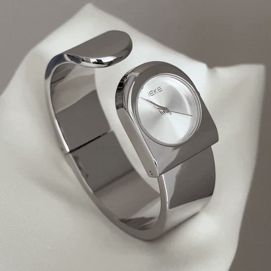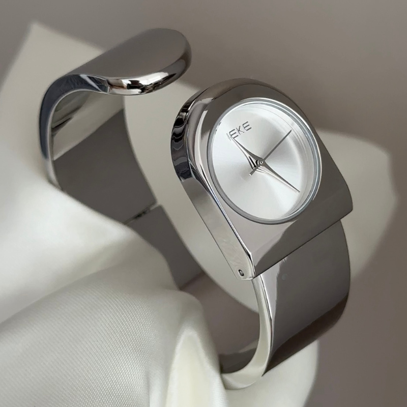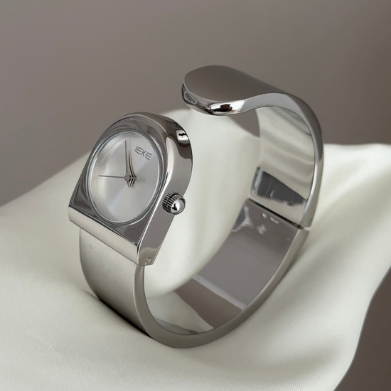 Merging minimalist watchmaking with contemporary jewelry, this cuff watch features a white dial set in a polished silver bezel and a secure hinged stainless steel bracelet. Scratch-resistant, water-resistant, and powered by reliable quartz movement, it transitions effortlessly from day to evening. A refined accessory, it serves as an ideal modern gift or a staple of understated style.