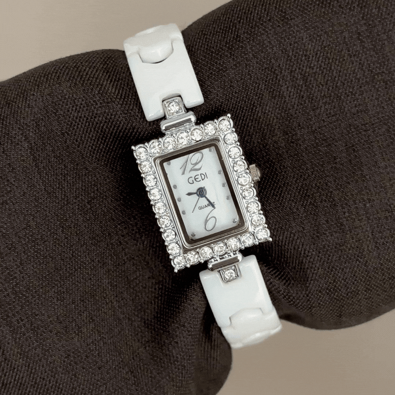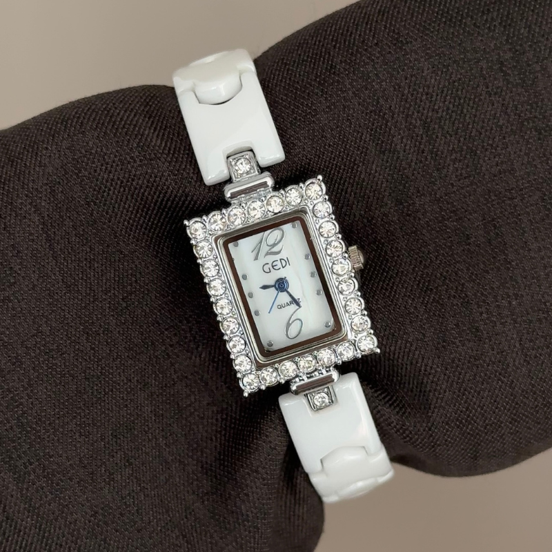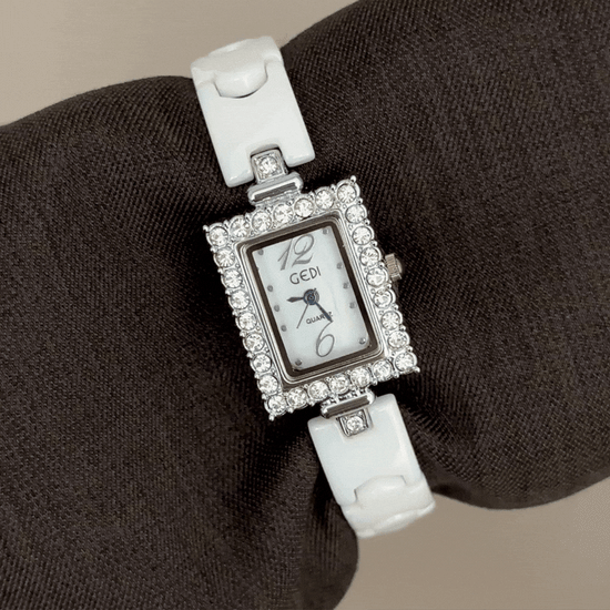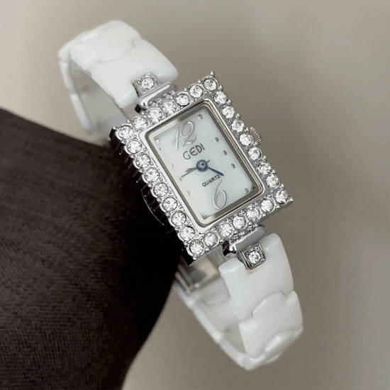 Redefining modern elegance, this watch blends cool ceramic with diamonds. Featuring a white rectangular dial, polished silver diamond-set bezel, and smooth, hypoallergenic white ceramic bracelet. Powered by reliable quartz, it is scratch-resistant and water-resistant for daily wear. A wearable expression of pure sophistication—ideal as a cherished gift or personal indulgence.