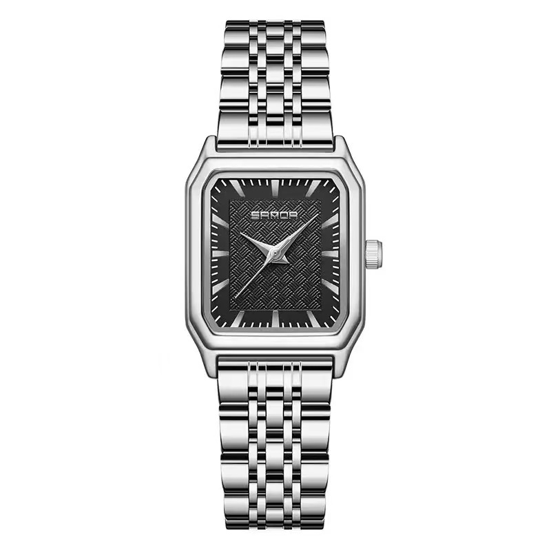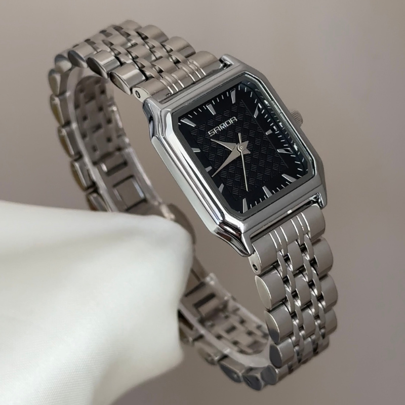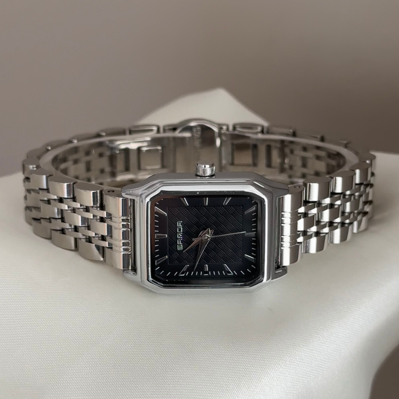 Showcasing sharp geometric lines, this watch pairs a black rectangle dial with a polished silver bezel and matching stainless steel bracelet. It ensures durable, all-day comfort and precise quartz timekeeping, while its minimalist design transitions effortlessly from professional daytime to elegant evening occasions.