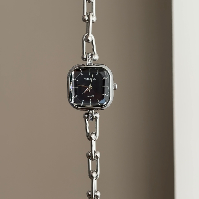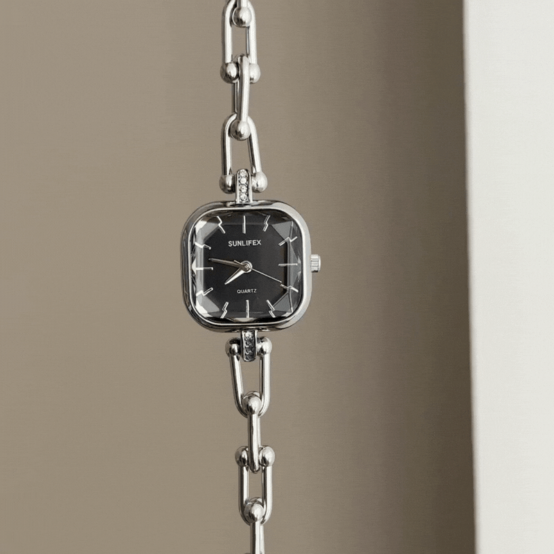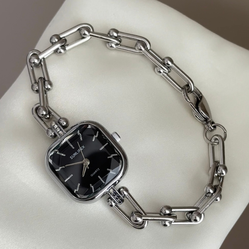 Defined by sharp contrast and clean geometry, this watch features a black square dial framed by a silver bezel and matching bracelet. Powered by reliable quartz, it is durable and comfortable for daily wear. Versatile from work to social settings, it’s an ideal gift or personal statement of confident, modern style.