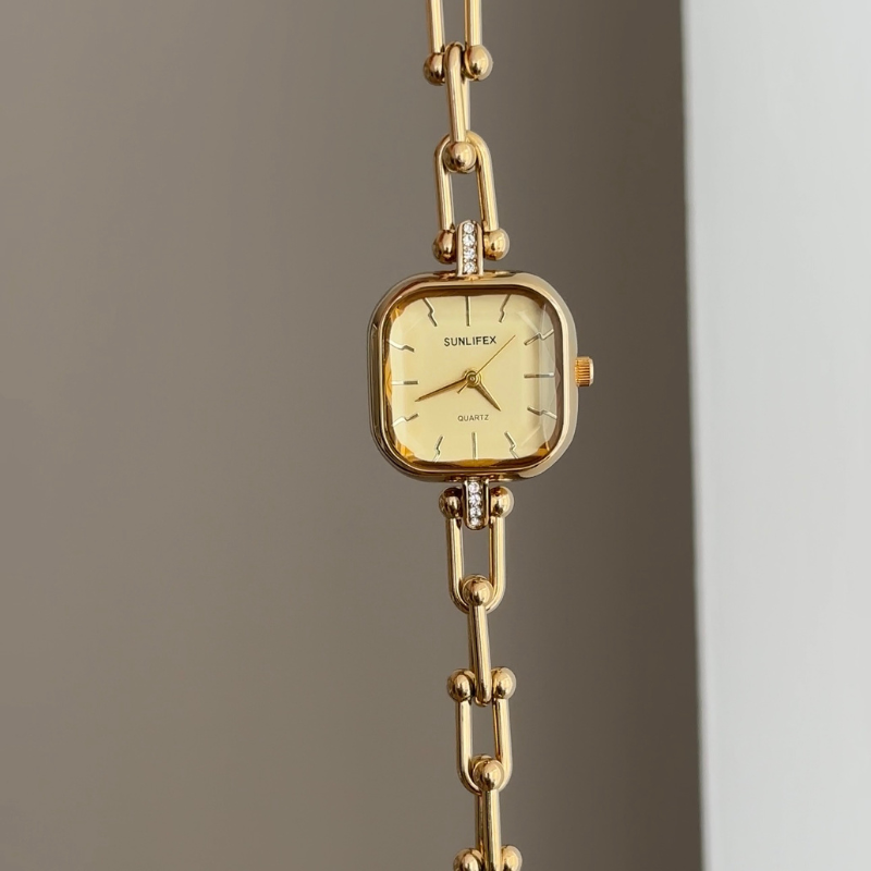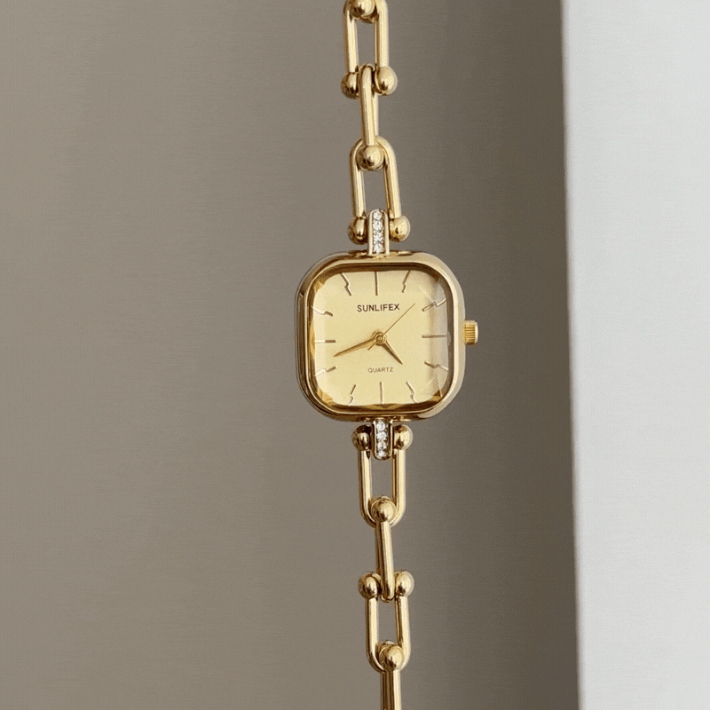 Defined by pure gilded geometry, this watch features a luminous gold square dial, matching bezel, and integrated bracelet. Powered by precise quartz, it is durable and comfortable for daily wear. Versatile from day to evening, it’s an ideal gift or personal emblem of confident, modern opulence.