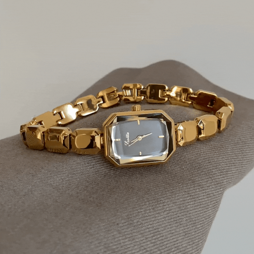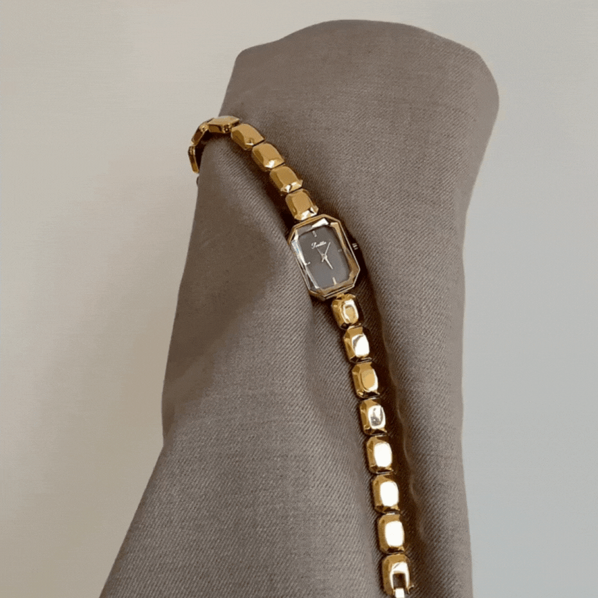 This women’s quartz watch features a sleek black rectangular dial, framed in warm gold and paired with a distinctive beaded chain bracelet that adds subtle texture and charm. The minimalist face and clean lines offer a modern, confident look—while the bracelet brings in a jewelry-inspired elegance.