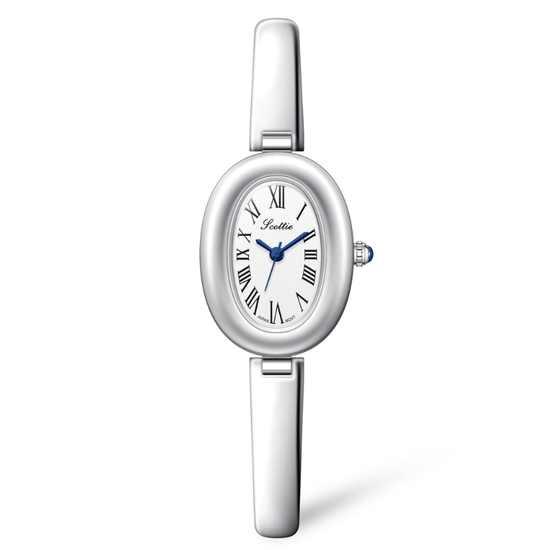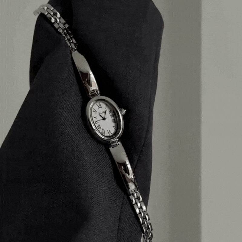 ⚪ White Oval Dial – Minimalist face that enhances the graceful silver tones.
