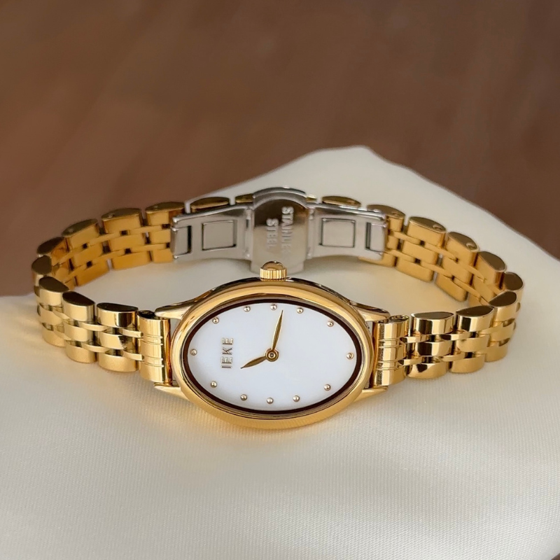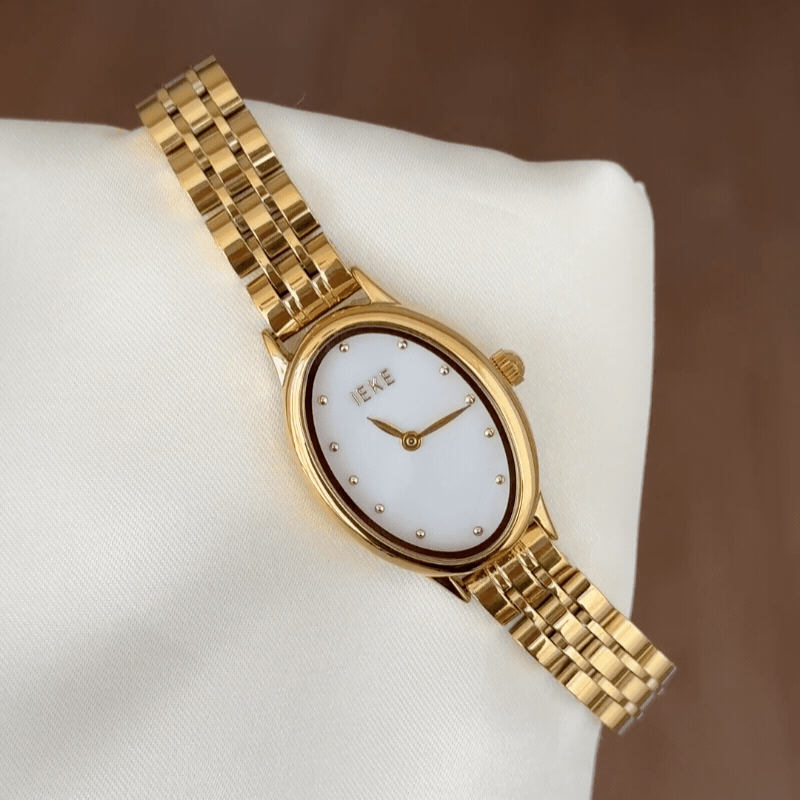 White oval sunburst dial, polished gold bezel, matching gold bracelet. Quartz, lightweight, scratch & water-resistant. Timeless soft curves and warm gold, day to night—ideal as a gift or personal indulgence.