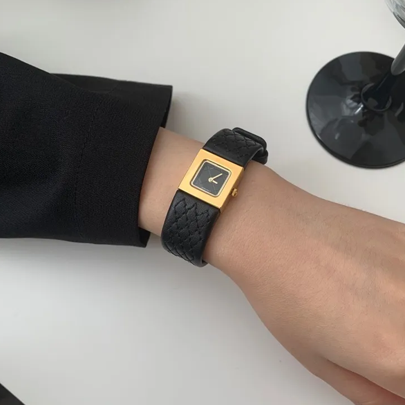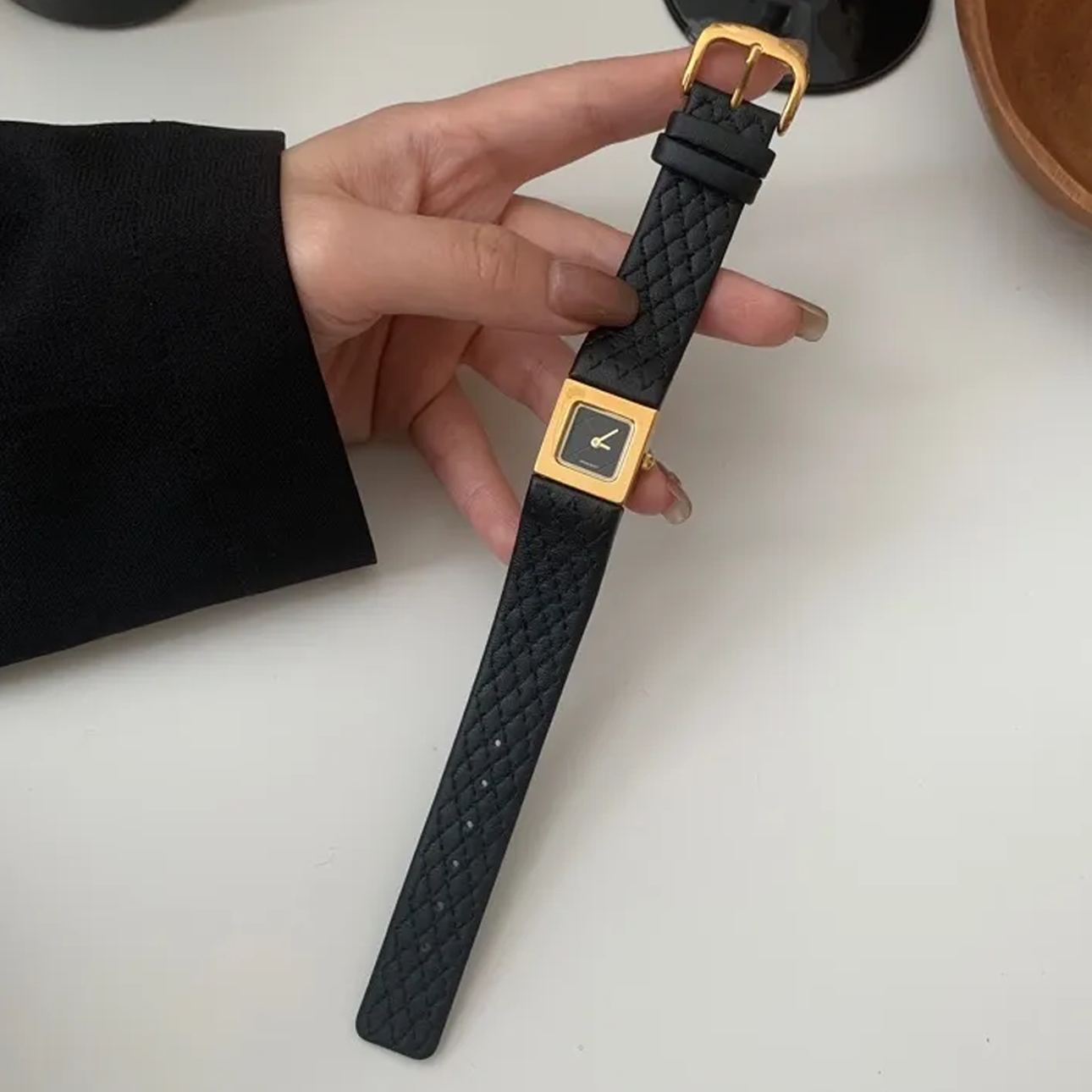 Parisian Chic Timepiece: Black Strap Gold Square Watch