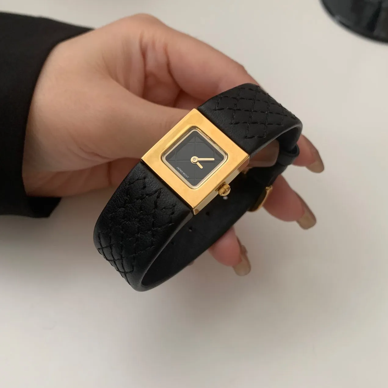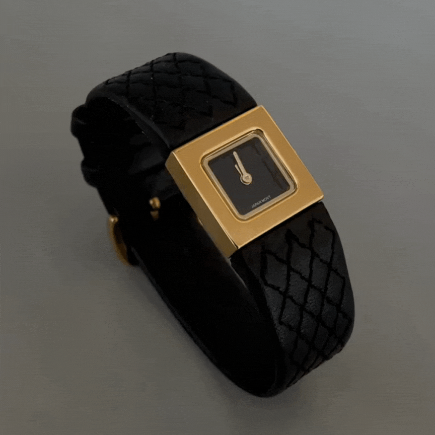 Introducing the Parisian Chic Timepiece, a perfect blend of French elegance and vintage allure. With its sleek black strap and luxurious gold-tone square case, this watch exudes timeless sophistication. The grid-patterned mesh design adds a refined touch of texture, while the French-inspired "cube" dial evokes the charm of a classic, yet modern, style. A true statement piece for those who appreciate fine details and high fashion, this watch will elevate any look with its understated luxury and chic appeal. Perfect for the fashionable woman with a flair for vintage charm.