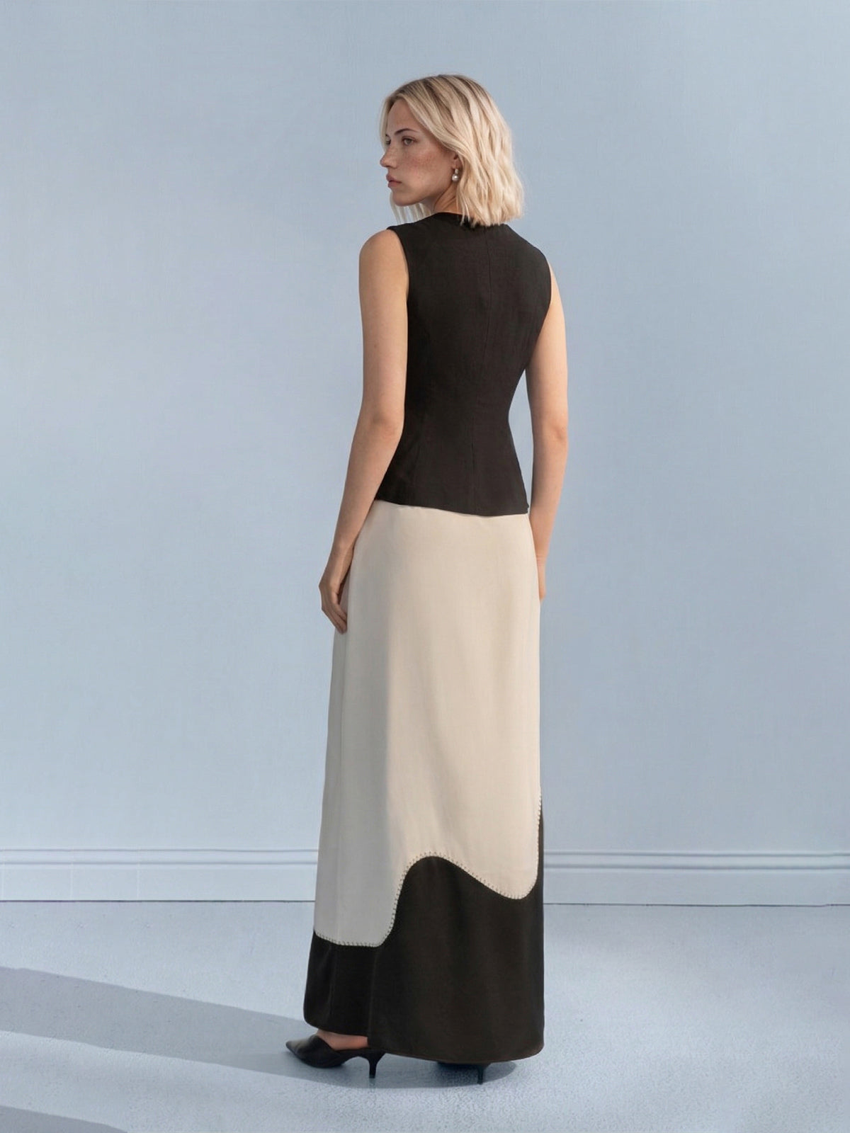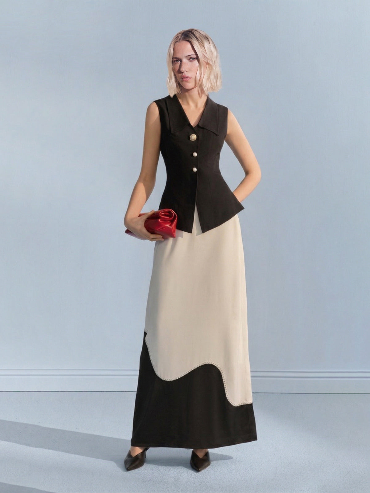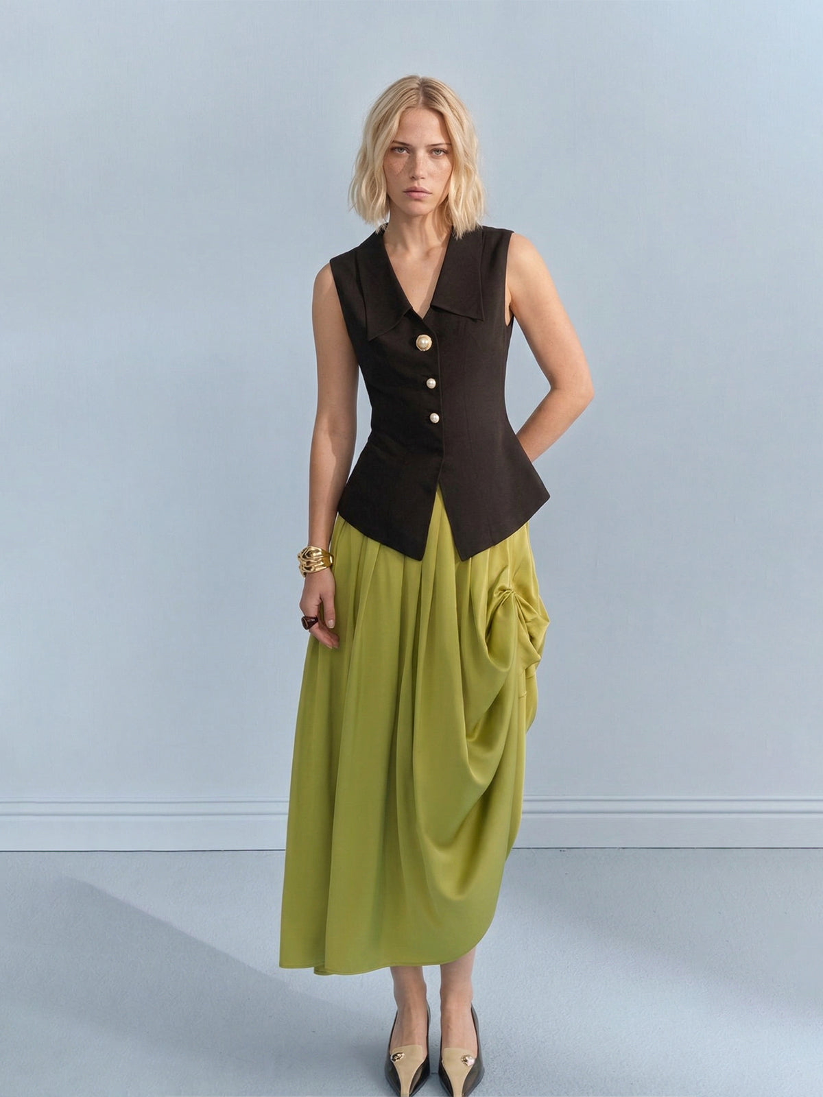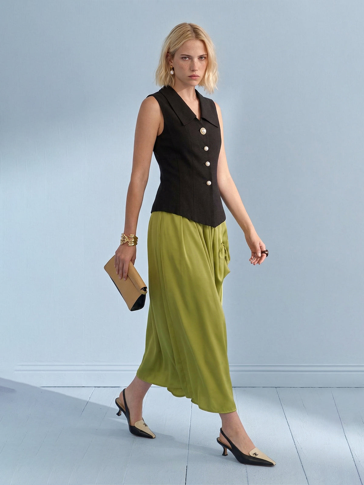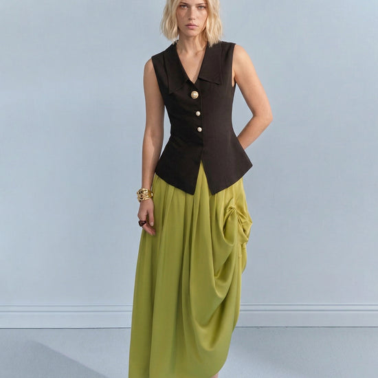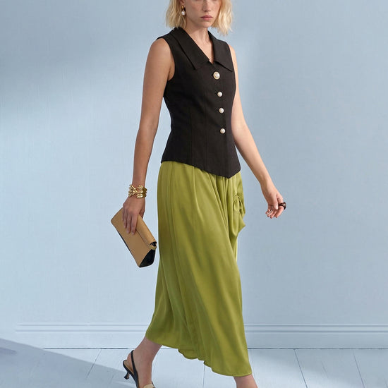 Embrace effortless sophistication with this tailored Lyocell-linen blend vest, featuring a signature wide notched collar and ornate pearl button accents. Designed with a body-contouring snatched-waist silhouette, this architectural piece offers a breathable "zero-pressure" feel for professional spring and summer styling.