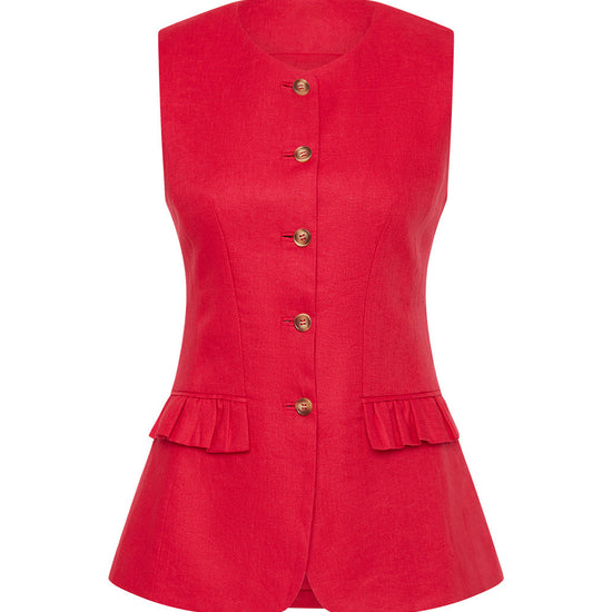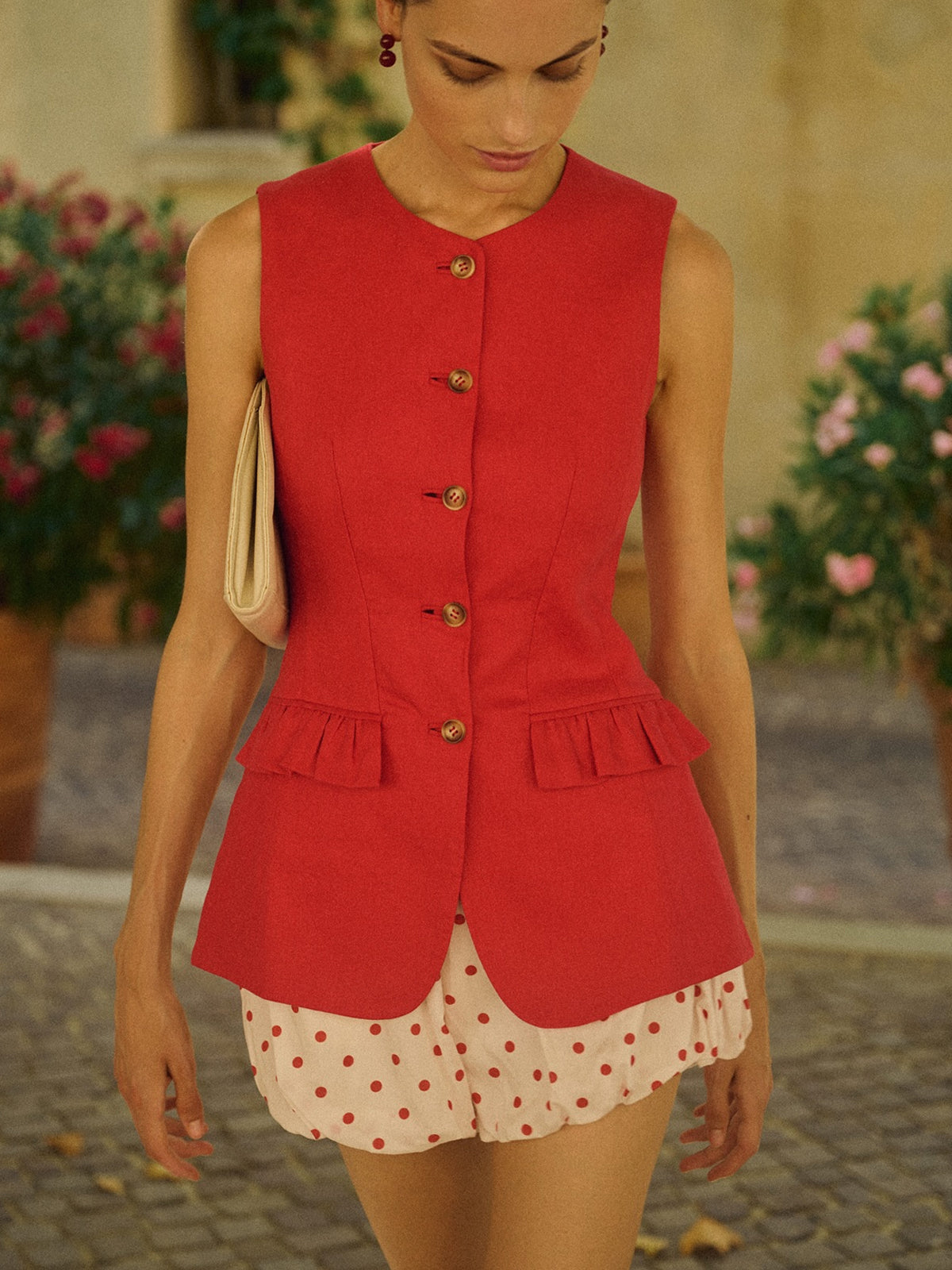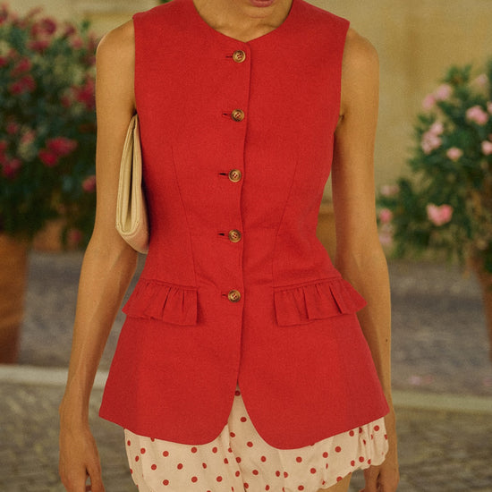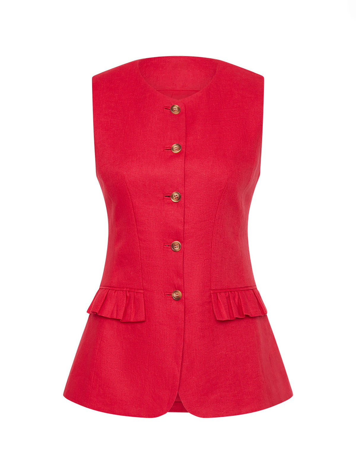 Elevate your summer vacation wardrobe with this vibrant red linen vest, featuring a sophisticated round neck and unique ruffled pocket detailing. Its structured peplum-style hem creates a flattering snatched-waist silhouette, making it the perfect architectural piece for effortless warm-weather elegance.