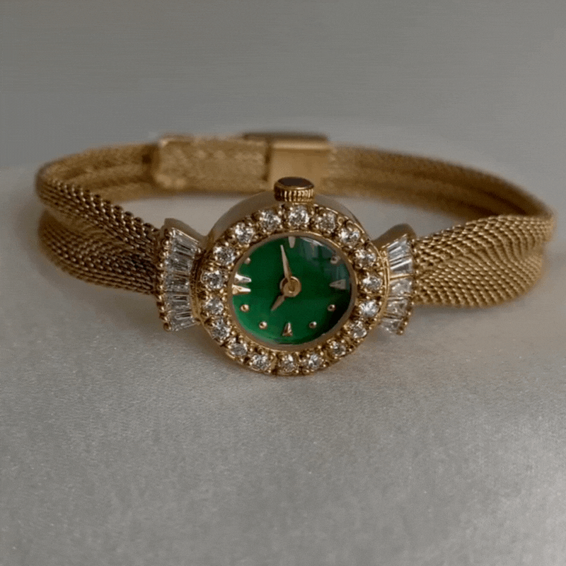 Introducing the Regal Emerald Timepiece, a symbol of timeless grandeur and refined beauty. Featuring a luminous gold-toned bracelet, a captivating green dial adorned with delicate diamond accents, and a petite, sophisticated design, this watch seamlessly blends vintage charm with modern elegance. Perfect for making an impression at any event, it’s a true testament to luxury and style.