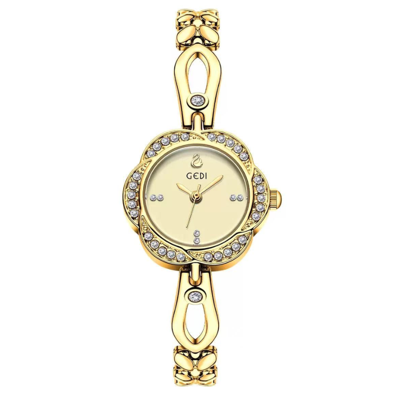 Capturing the essence of poetic romance, this exquisite timepiece presents a gold floral dial adorned with delicate petal motifs, elegantly framed by a diamond-set bezel. The complementary gold-tone alloy bracelet provides secure comfort for daily wear through its polished finish and reliable clasp.
