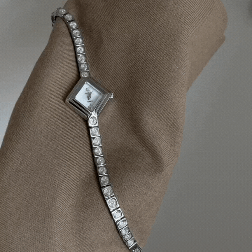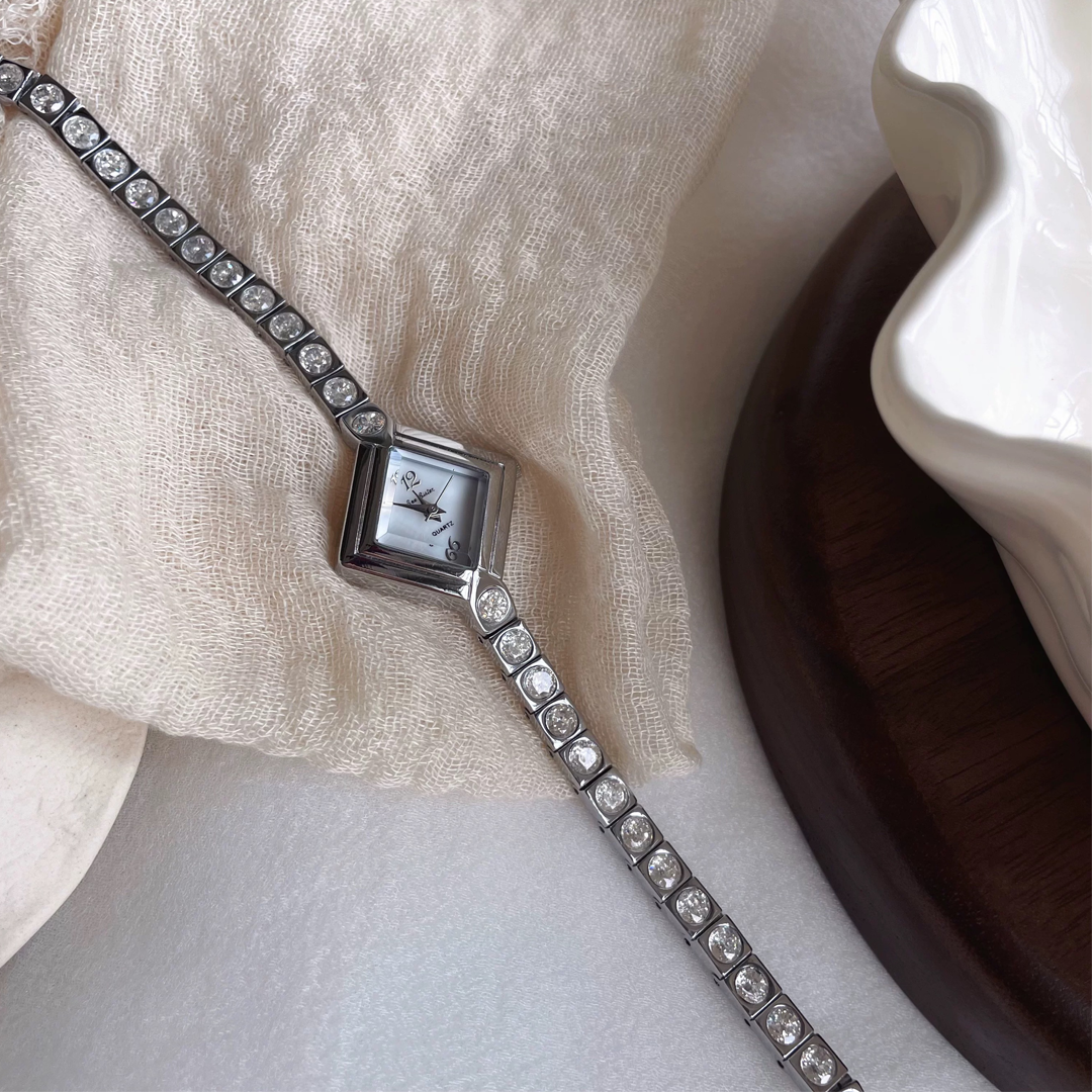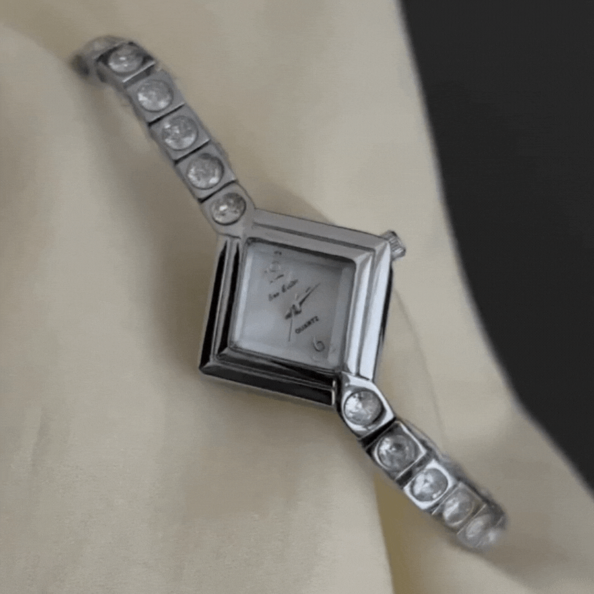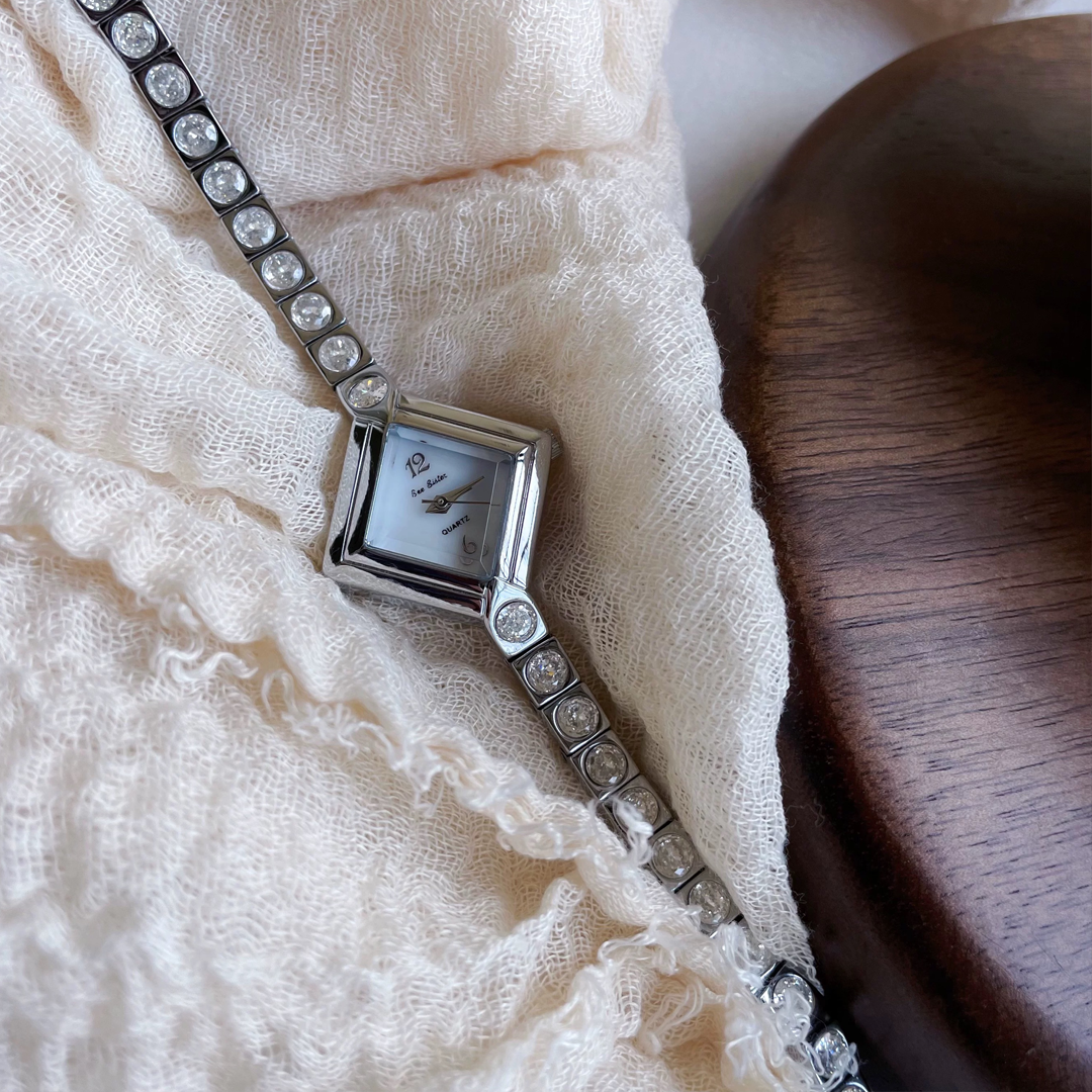 This exquisite quartz watch features a white rhombus-shaped dial and a silver-tone bracelet adorned with sparkling diamonds, combining elegance with sophistication. With precise quartz movement and a timeless design, it’s the perfect accessory for both professional and special occasions.