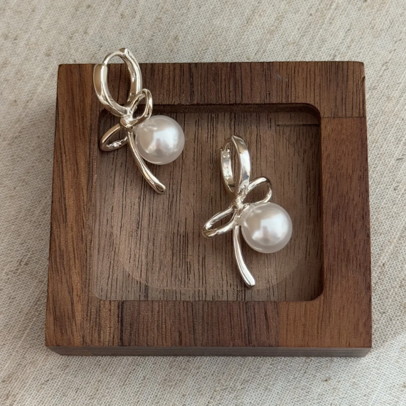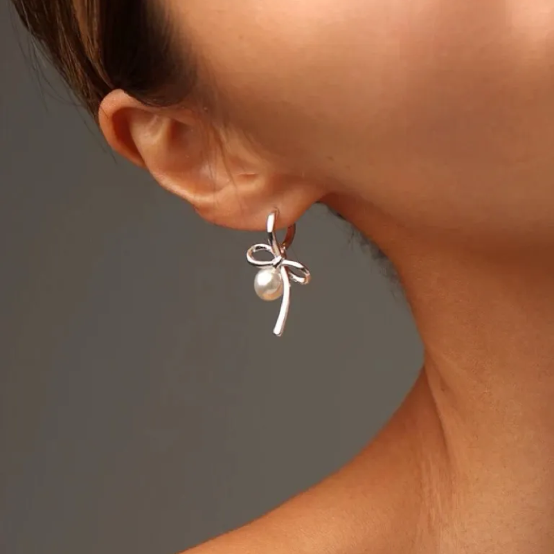 These delicate silver bow earrings feature a luminous pearl center paired with a refined, minimalist bow design. Crafted from silver-plated copper with S925 sterling silver posts, they offer comfortable, hypoallergenic wear.