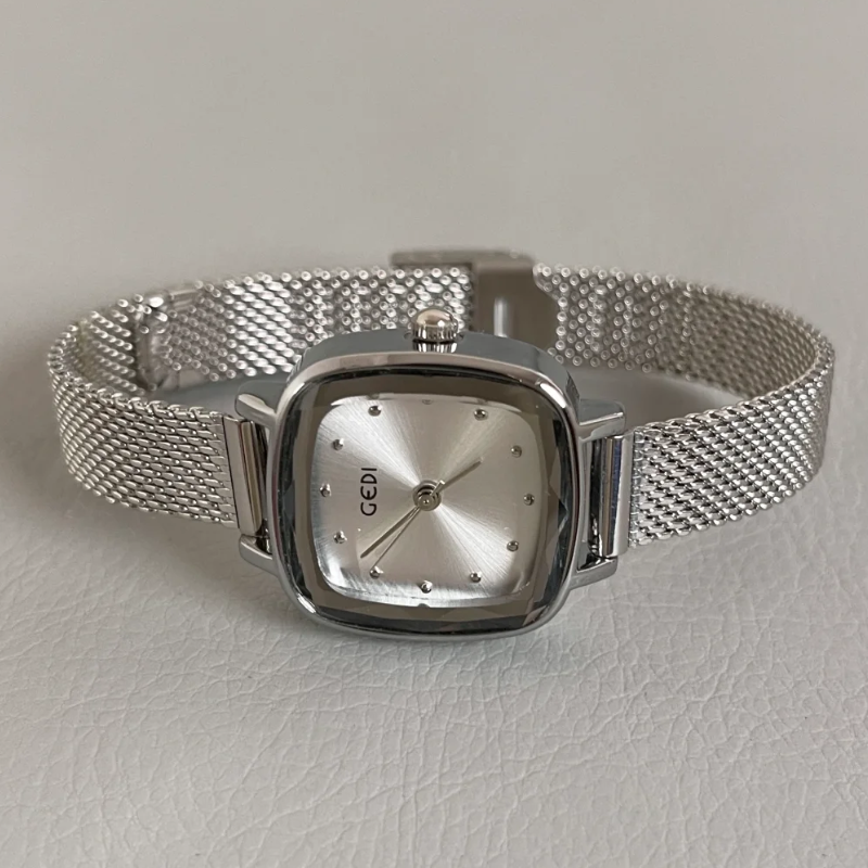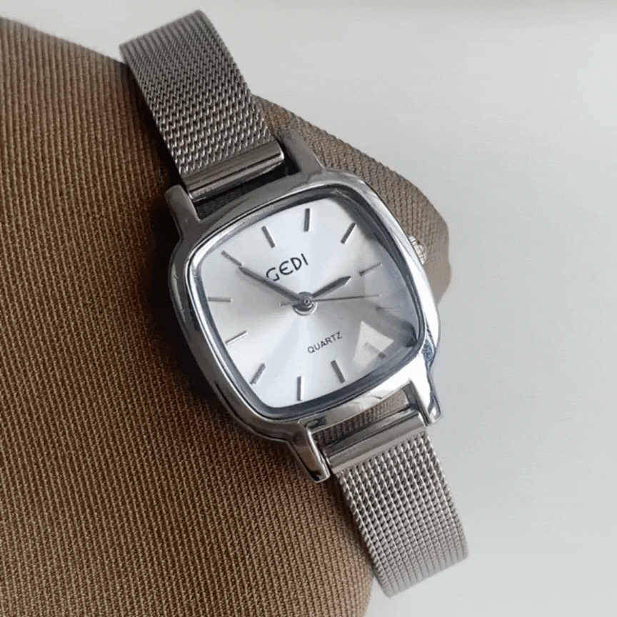 This elegant ladies' quartz watch features a refined silver strap and a petite square "sugar cube" dial. With its minimalist yet sophisticated design, it adds a touch of effortless charm to any outfit.