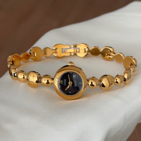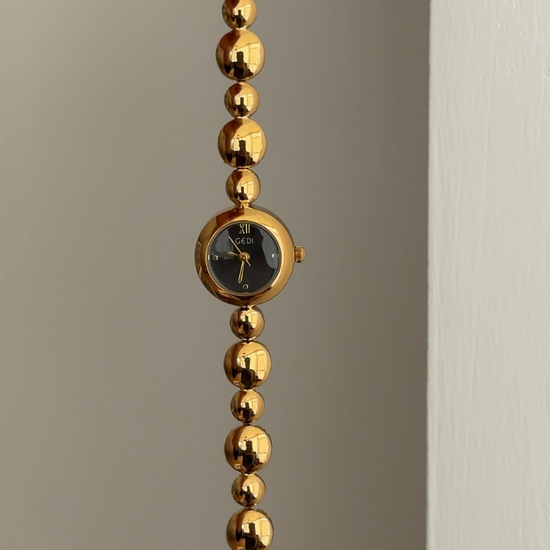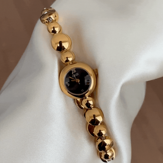 Urban Black Dial Watch - Gold Round Case & Beaded Bracelet