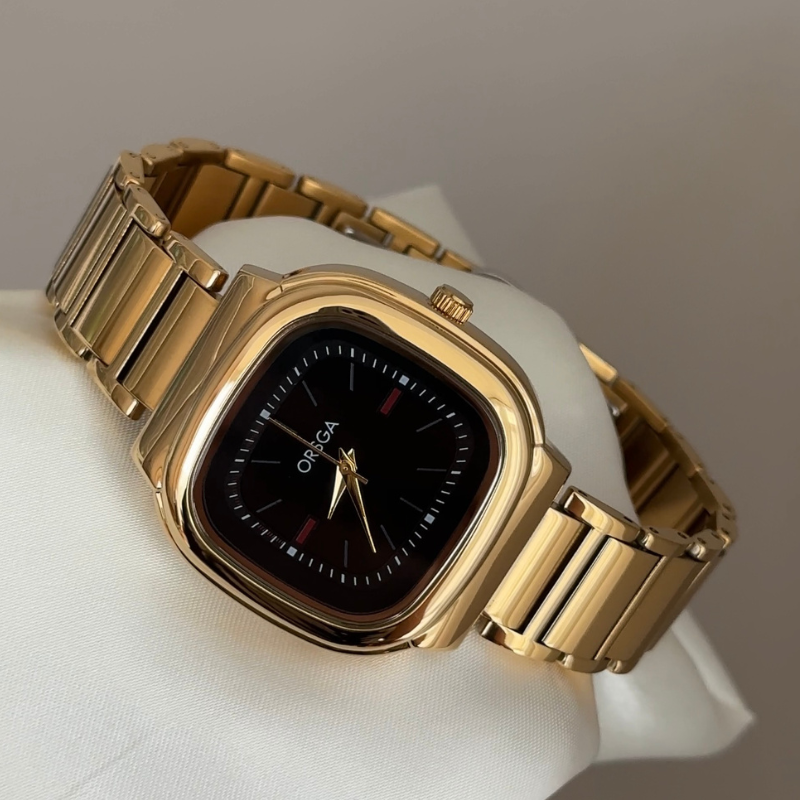 This sophisticated timepiece radiates executive elegance with its black rectangular dial and polished gold bezel. The matching gold stainless steel bracelet is crafted for durability and comfort. Precision quartz movement ensures accurate timekeeping in its contemporary silhouette.
