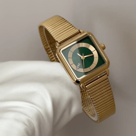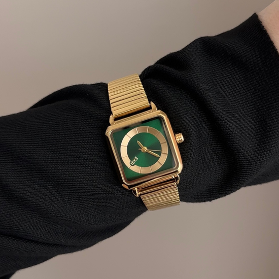 A deep green rectangular sunburst dial, polished gold bezel, and integrated gold stainless steel bracelet. Quartz-powered, lightweight, scratch & water-resistant. Natural freshness meets refined geometry—perfect for daily wear, gifting, or personal indulgence.
