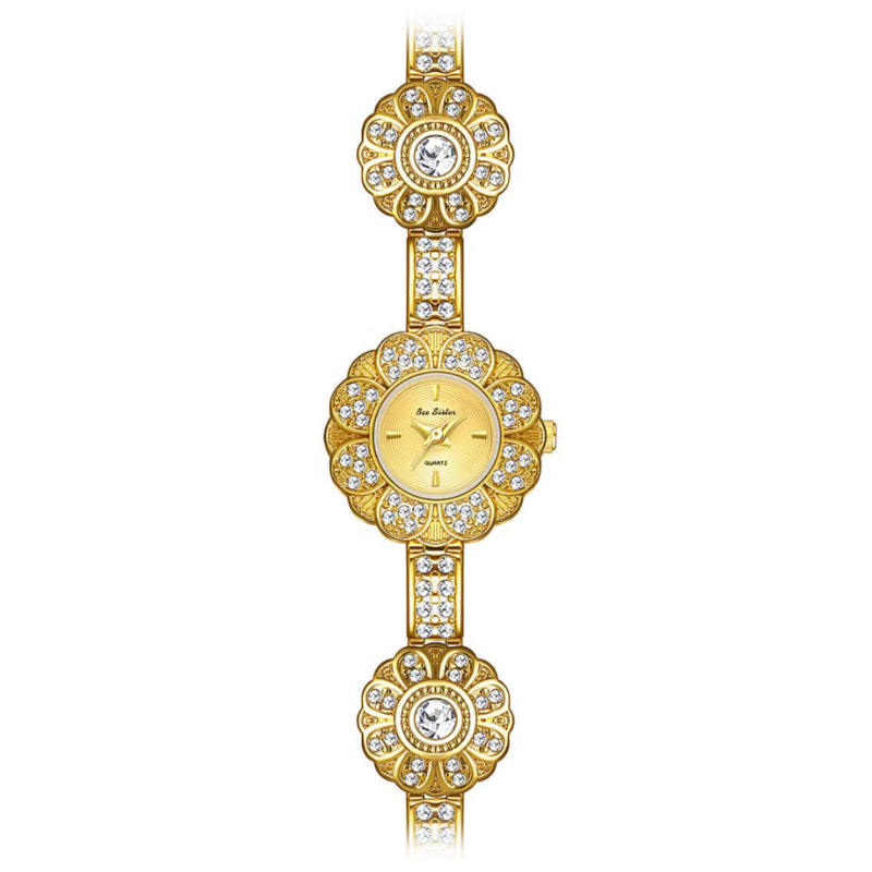 Adorn your wrist with timeless elegance through our vintage floral watch, where classic design meets refined artistry. It features a radiant gold dial set in a floral-inspired gold frame adorned with sparkling crystals, paired with a matching alloy bracelet for harmonious sophistication. Powered by precise quartz movement, it ensures accurate timekeeping with minimal care.