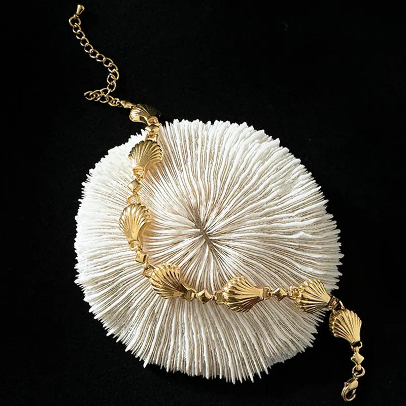 Crafted from high-retention 18K gold-plated copper, the bracelet features a delicately sculpted shell charm that reflects a soft golden sheen — reminiscent of sunlit beaches and classic vintage style.