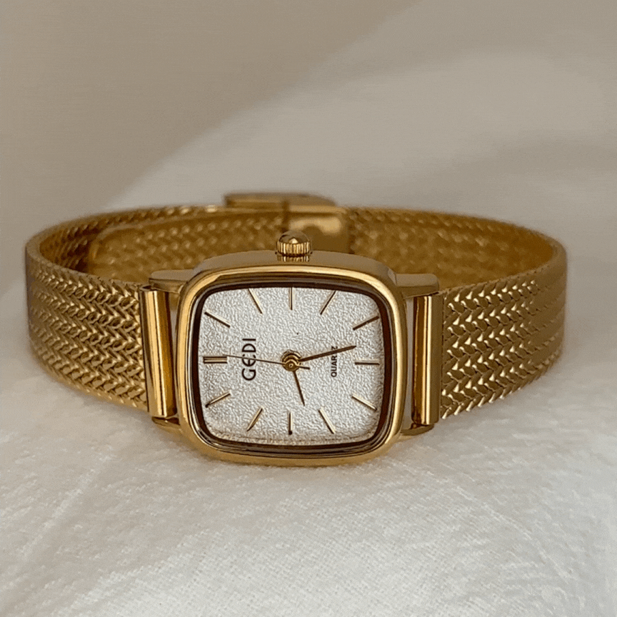 Inspired by vintage French elegance, this women’s quartz watch features a gold wheat chain bracelet that exudes classic refinement. The square case frames a sparkling white textured dial, creating a luxurious play of light and detail that elevates any outfit.
