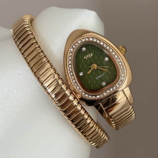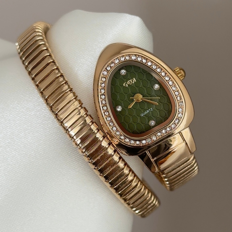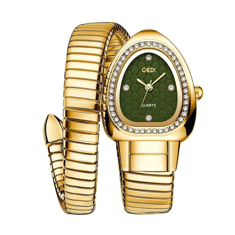 Embodying the serpent's allure, this watch features a sculpted green serpent-head dial, diamond-set gold bezel, and interlocking gold alloy loop bracelet. Powered by quartz, it is lightweight, scratch-resistant, and water-resistant for daily wear. A bold symbol of power, it transitions from day to night—ideal as an unforgettable gift or personal treasure.