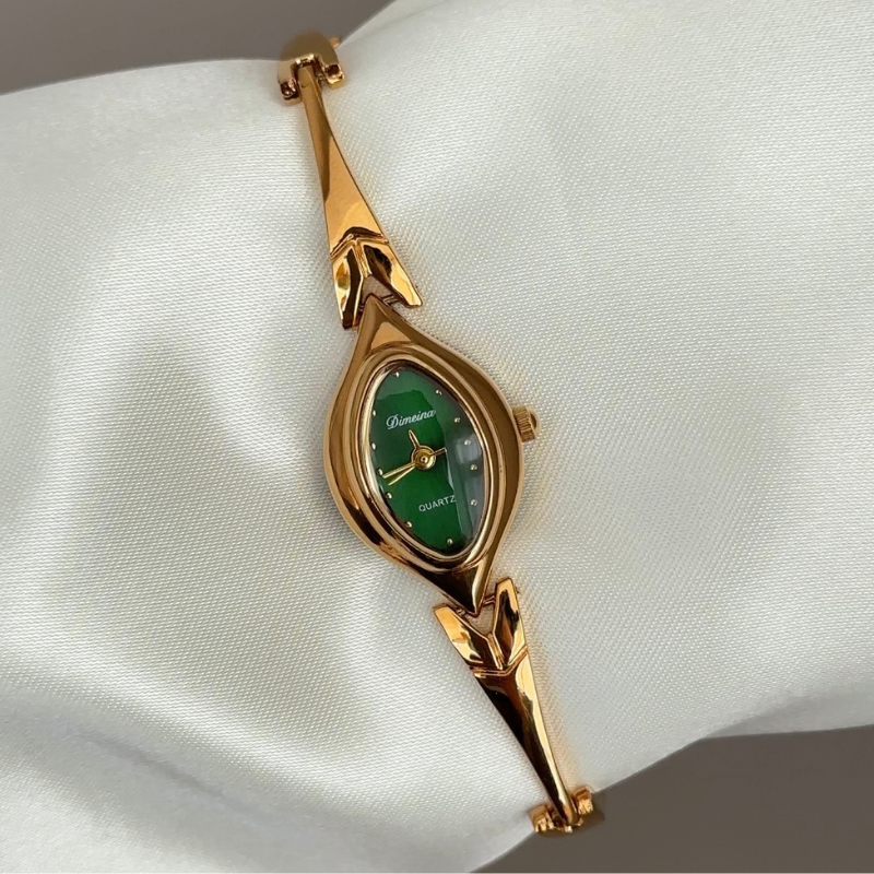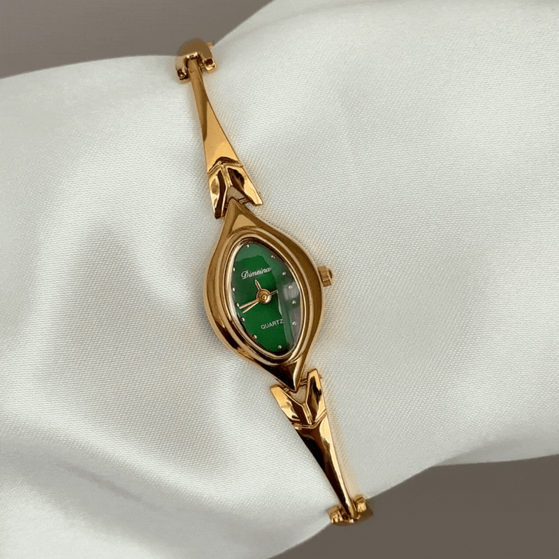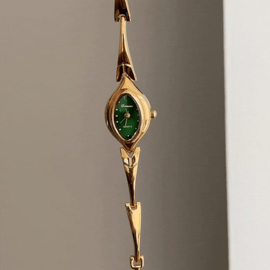 A poetic tribute to nature, this watch features a leaf-shaped green dial framed by a matching gold leaf bezel and a slim gold stainless steel bracelet. Powered by quartz, it is lightweight, scratch-resistant, and water-resistant for daily wear. A wearable fragment of nature, it transitions from day to evening—ideal as a serene gift or personal reminder of life's graceful moments.