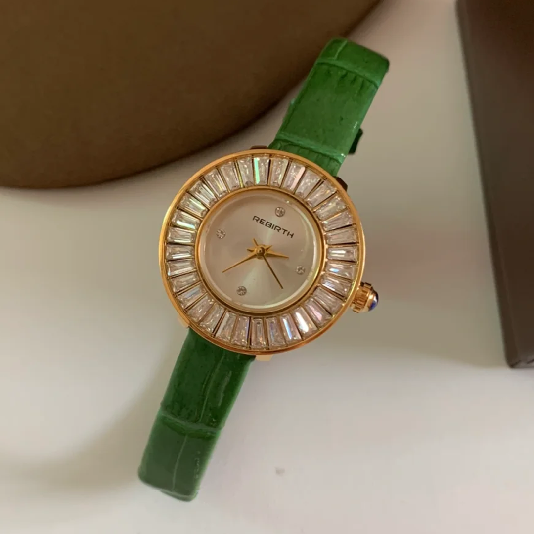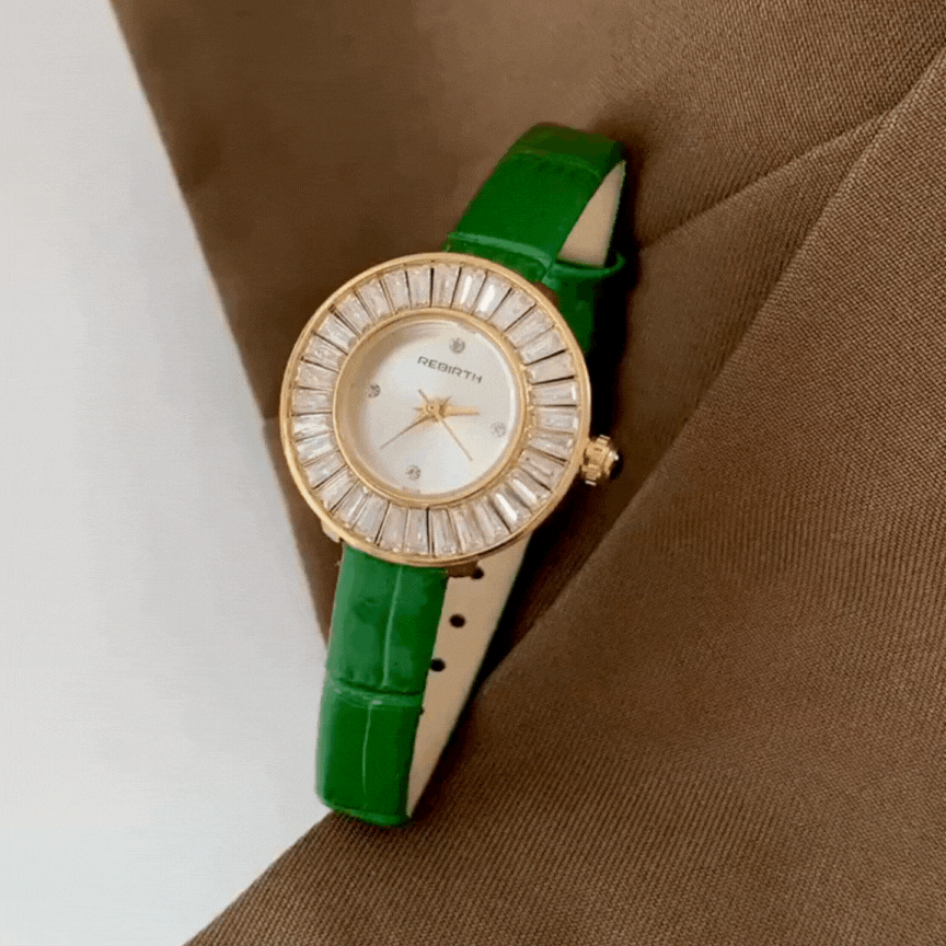 Denna damkvartsklocka har en mjuk grönt äkta läderarmband, inramar en delikat pärlemorurtavla omringad med glittrande kristallaccenterDet runda fodralet ger tidlös charm, medan den fräscha gröna nyansen ger en förfinad färgklick till din vardagslook.