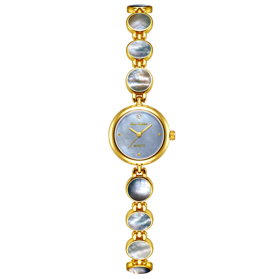 Omfamna raffinerad sofistikering med detta Rund damkvartsklocka med pärlemorurtavla i armbandsstil, ett mästerverk av fint hantverk och feminin charm. Klockan har en lysande rund urtavla i pärlemor som visar upp naturliga skimrande nyanser som skiftar graciöst med ljuset, i kombination med ett elegant, justerbart silverkedjearmband för sömlös komfort. Varje urtavla i pärlemor är unikt mönstrad, vilket säkerställer att din klocka är unik. Drivs av ett exakt kvartsurverk kombinerar den pålitlighet med diskret lyx, vilket gör den perfekt för vardaglig elegans eller speciella tillfällen.