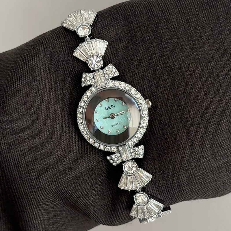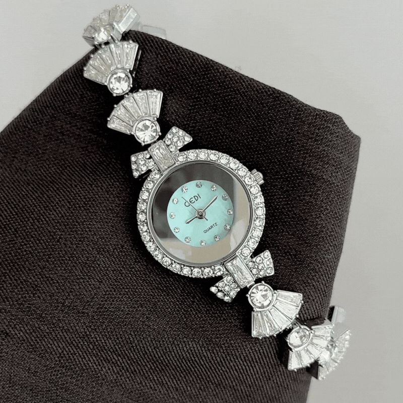 This timepiece combines a vibrant green dial, a silver diamond bezel, and a matching diamond-adorned bow-design alloy strap for lightweight, all-day comfort and precise quartz timekeeping. Its enchanting design transitions seamlessly from sweet daytime sophistication to a charming focal point for evening occasions.