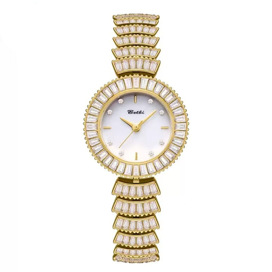 Crafted for seamless elegance, this watch boasts a pristine white dial, a gold diamond bezel, and a matching fully-studded stainless steel bracelet, ensuring comfortable daily wear and precise quartz timekeeping. Its radiant design transitions effortlessly from daytime sparkle to evening sophistication.
