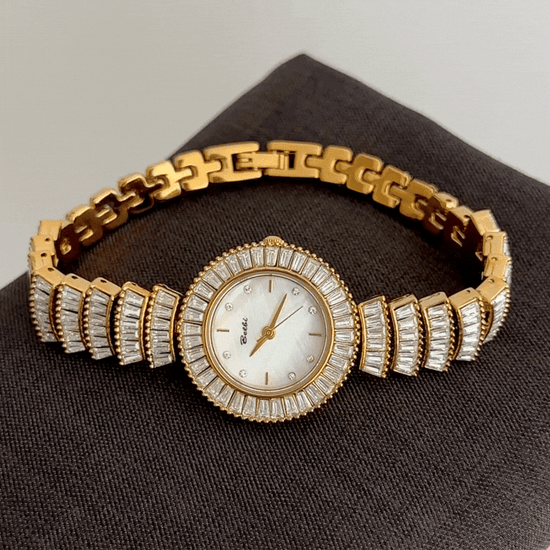 French Pearl Timepiece: Luxe Gold Bangle Quartz Watch