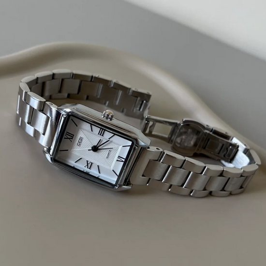 Denna damkvartsklocka har en ren vit urtavla prydd med subtila geometriska element, i kombination med en elegant silverfärgat armbandDesignad för älskare av struktur, rymd och lugn självförtroende – det är ett enkelt och modernt plagg som passar till allt men ändå känns som inget annat.