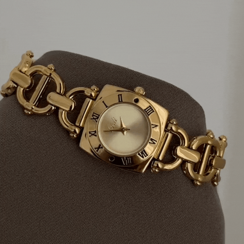 Denna damkvartsklocka kombinerar en rund romersk siffra med en geometriskt fyrkantigt guldfärgat fodral, allt förankrat av en raffinerad guldfärgat armband med kedjelänkarDesignen med blandade former framkallar tidlös sofistikering med en arkitektonisk touch – perfekt för dig som älskar tradition i en nytolkning.