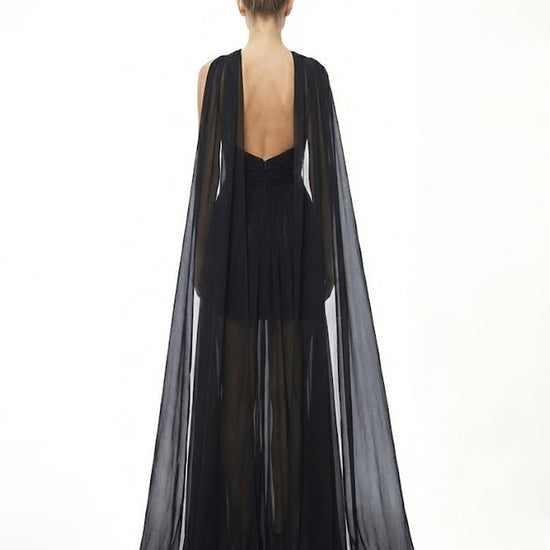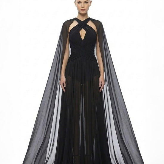 Embrace dark romance in this ethereal and statuesque creation. The halter-style bodice features a daring keyhole cutout and structured criss-cross waist detailing to define the figure. Dramatic, floor-sweeping cape panels flow from the shoulders, adding regal movement to the airy, pleated skirt. This piece is finished with a stunning open-back design, making it a captivating choice for high-end celebrations.