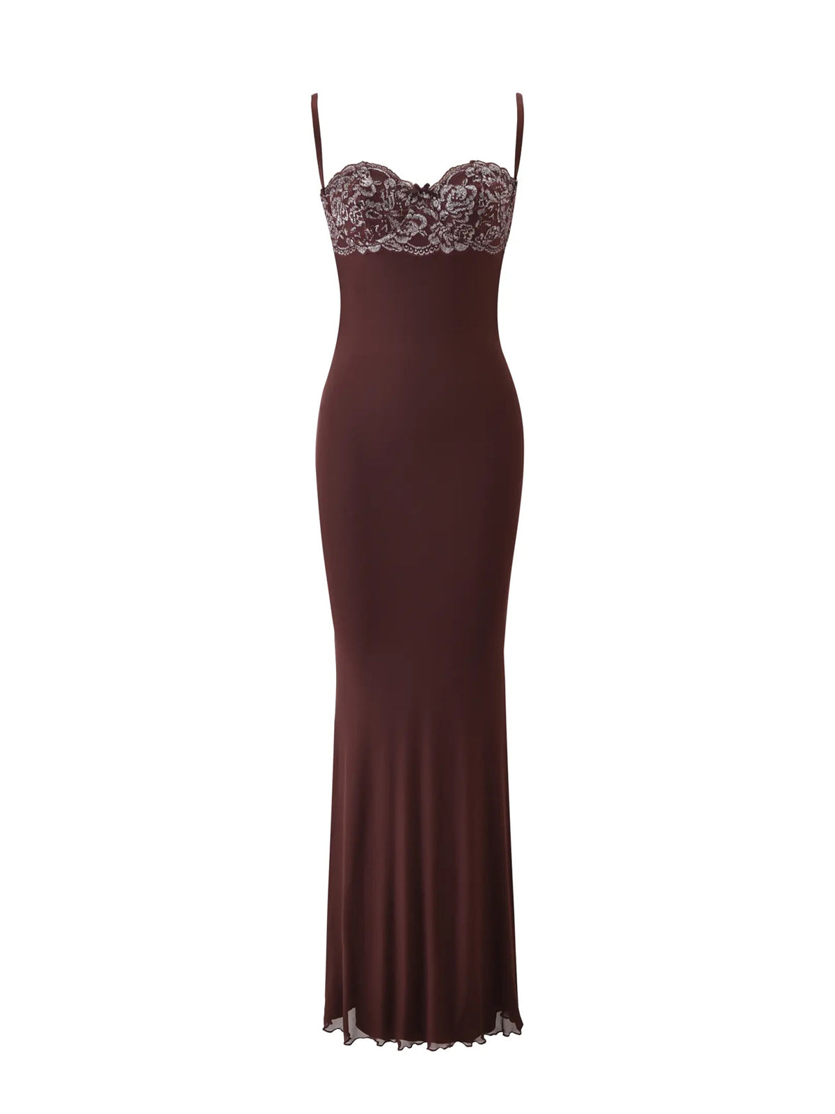 Lace-Embroidered Sweetheart Silhouette Spaghetti Strap Maxi Dress