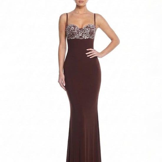 Exude effortless romance in this sophisticated and figure-sculpting creation. This piece features a beautifully detailed floral lace bust and a flattering sweetheart neckline, supported by delicate spaghetti straps. The body-skimming silhouette is crafted from a smooth, supple material that flows gracefully to the floor for a statuesque look. Whether for upscale lounging or an intimate evening, this outfit defines modern elegance.