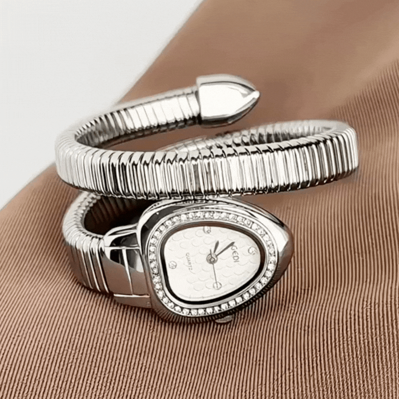 This luxury-inspired women’s quartz watch features a sleek silver bangle bracelet, a striking snake head design with crystal accents, and a clean white dial.