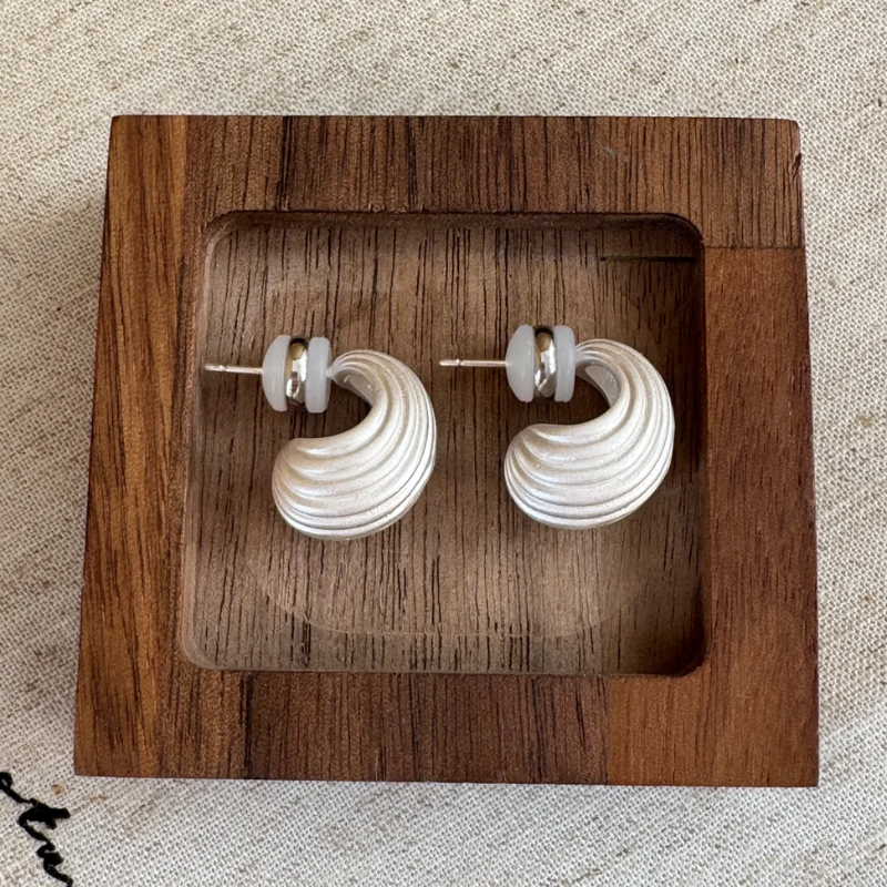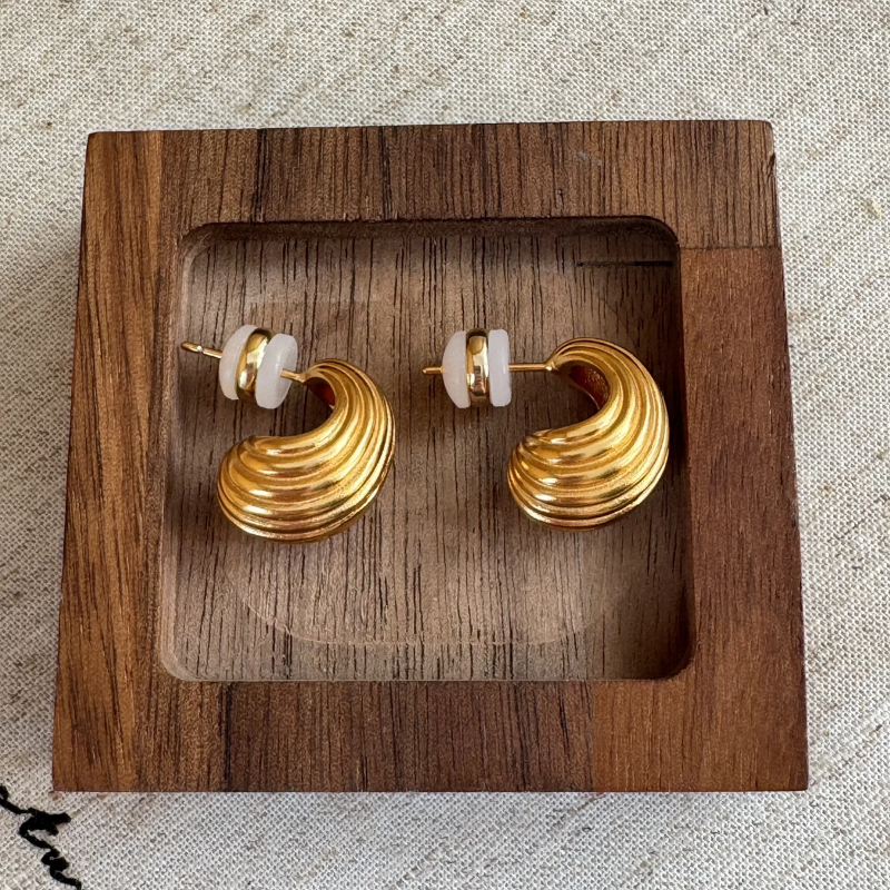 These modern conch-inspired earrings feature soft, sculptural shell curve textures that blend minimalism with a touch of seaside elegance. Crafted from brass plated with real 18K gold and platinum, and fitted with S925 sterling silver posts, they ensure comfortable, hypoallergenic wear.
